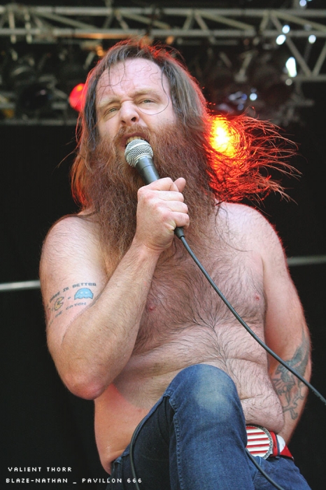 Une heure plus tard, c’est un groupe avec un nom « à coucher dehors » qui monte sur les planches. Il s’agit de PHYLLISDIETRICHSON originaire d’Annemasse, en Haute-Savoie. Le combo pratique une espèce de grind touche-à-tout qu’il nomme screamo rock n’roll. Et sur scène ce n’est qu’énergie brut de décoffrage, ça passe ou ça casse. Mais aujourd’hui ça passe carrément. Rien de tel pour démarrer la journée et nous mettre dans le bain du festival. Ce ne sera pas le bain mousse, c’était hier au soir, mais le bain d’une prestation graveleuse à l’image d’un chanteur vous crachant ses tripes à la figure et de musiciens s’envoyant en l’air sur les retours. Très bon moment passé en leur compagnie, ce fut court mais intense comme on dit dans ces cas là ! Il est maintenant l’heure de vibrer avec les ultra-basses crépitantes sortant des amplis verts avec la musique de CULT OF OCCULT. Du sludge, du doom au menu avec la voix d’outre-tombe, la voix de Satan «himself » qui vous plonge dans les entrailles infernales de la terre. Les riffs pachydermiques sont monstrueux, on plaque les instruments contre les amplis, ça grésille de partout, c’est infernal et c’est bon, c’est sale et dégoulinant de noirceur occulte évidemment. Peut-être que le public d’aujourd’hui n’apprécie pas forcément ce déluge sonore ultime qui vous remonte les tripes au cerveau, mais en ce qui me concerne, j’ai largement apprécié la messe noire de CULT OF OCCULT. Ce groupe possède déjà une bonne place en Europe dans le style et il le mérite largement, preuve en est cet après-midi au Sylak open air avec une démonstration évidente de maîtrise sonore. Néanmoins, une soirée dans une cave underground ou autre lieu du genre serait encore plus appréciée. Restons en compagnie des groupes lyonnais avec FRONTAL qui investit la scène à 14 heures 35. Après une période d’atermoiement, le groupe est reparti de plus belle avec son frontman charismatique Diègo et l’annonce d’un nouvel album pour 2014. Mais aujourd’hui, là tout de suite, « on stage » que vaut FRONTAL ? Et bien les musiciens envoient de plus belle avec un deathcore particulier où le côté technique n’entâche en rien le « groove ». Les titres sont musclés, les compositions variées, l’impact scénique important, que demander de plus ? Diègo et ses sbires ont donc prouvé aujourd’hui qu’il fallait à nouveau compter avec eux à l’avenir. On apprécie largement et on attend la suite de leurs aventures métalliques. VALIENT THORR au Sylak, vous en aviez rêvé vous les amateurs de heavy-rock costaud et démonstratif, vous qui les aviez appréciés au Hellfest il y à quelque-temps et plus récemment à l’Ampérage de Grenoble. Et bien les barbus de Caroline du nord aux USA sont là ce samedi après-midi et vont brûler les planches, c’est sûr. Les troupes sont fraîches, en parlant du public, ceux de Valient Thorr aussi, et une ambiance de « ouf » va s’installer progressivement sur scène et devant. Le frontman en fait des tonnes et rameute sans arrêt l’assistance qui suit évidemment. Il va même au milieu du public pour faire « ramer » les gens, les emmener dans le trip heavy-rock musclé. Dommage que le son ne fut pas très bon et grésillant, mais l’énergie et la présence a fait le reste. On aime, que-dis-je on adore, alors ferez vous partie maintenant des « thorriors », fans du groupe qui suivent partout les ricains avec des vestes en jeans larges comportant le logo du groupe dans le dos ? Oui assurément, je le sens bien après ce show époustouflant. Restons dans le heavy-rock, le stoner plus précisément avec MONDO GENERATOR. Ce groupe a été formé par Nick Oliveri, bassiste/ chanteur qui a officié auparavant avec Josh Homme dans QUEENS OF THE STONE AGE. Stoner culte donc au menu et cela se ressent d’emblée par les envois, la présence scénique et la voix particulière de Nick. Alors forcément on est sous le charme du rock enfumé, mais très enlevé avec de nombreux dérapages punk évidemment. Personne ne s’y trompe ce samedi au Sylak, on remonte aux sources du style, si style il y a avec ce Mondo Generator qui nous marque la cervelle d’une empreinte indélébile. Les passionnés de stoner se sont régalés et les autres ont fait une bonne découverte, excellent tout simplement. Dire que BANANE METALIK était très attendu aujourd’hui, serait un doux euphémisme. Bien sûr, il y a ceux qui en ont entendu parler et qui sont impatients de voir ce que c’est. Et puis il y a tout ceux qui connaissent déjà et qui ne manqueraient pour rien au monde un live des rockeurs déjantés qui ont inventé le style gore n’roll, pourquoi pas. Leur réputation n’est plus à faire avec des sets incroyables où se côtoient l’horreur et le non-conformisme artistique. Maquillages sanguinolants et putrides, énergie, mise en scène particulière, tout concours a faire d’une prestation de la Banane un moment inoubliable. Ce soir le thème sera assez porté sur les parrains et la mafia toujours dans le même esprit et bien sûr, ce sera la folie sur scène et dans le public et vice-versa. C’est un show imparable qui mettra tout le monde d’accord. Groupe à revoir donc à volonté, show à consommer sans modération tout simplement, prochainement en tournée. Nous allons rester dans le gore pour la suite avec les espagnols de HAEMORRHAGE. HAEMORRAGE, c’est vingt ans de dissections, d’opérations chirurgicales, de ce sang, sur fond de grind. C’est unique dans le gore-grind avec des prestations bien saignantes où les musiciens manient le scalpel musical comme personne, leurs envois étant précis et tranchants, imparables donc. Habitués des festivals extrêmes comme l’Obscène extrême, mais aussi du Hellfest, ils sont venus à St-Maurice de Gourdans ce samedi soir pour nous éclabousser d’hémoglobine et nous faire savourer un