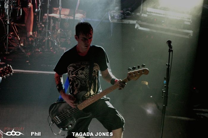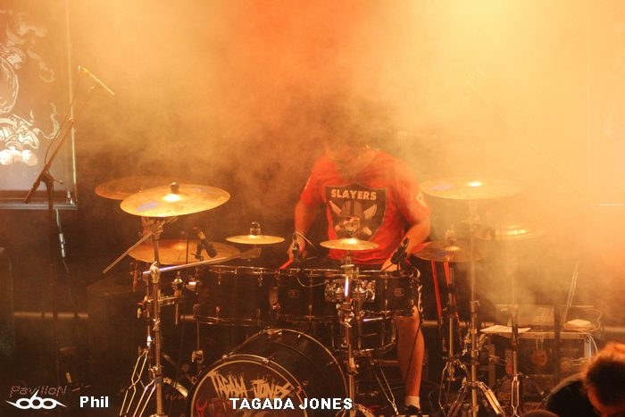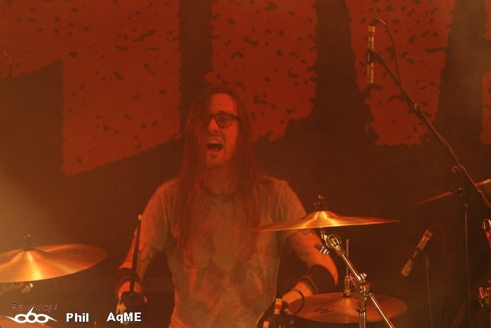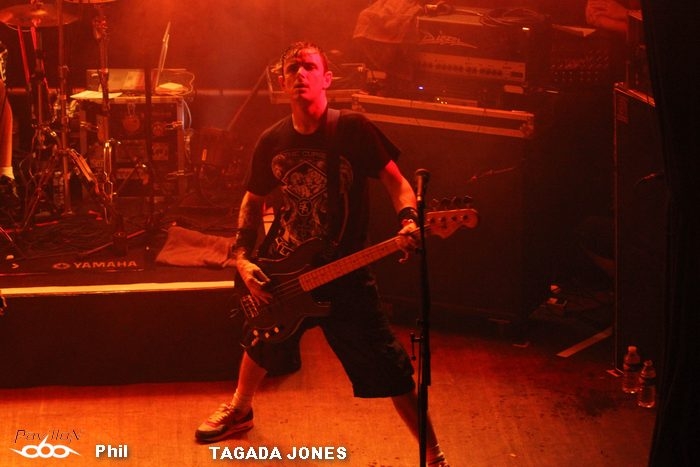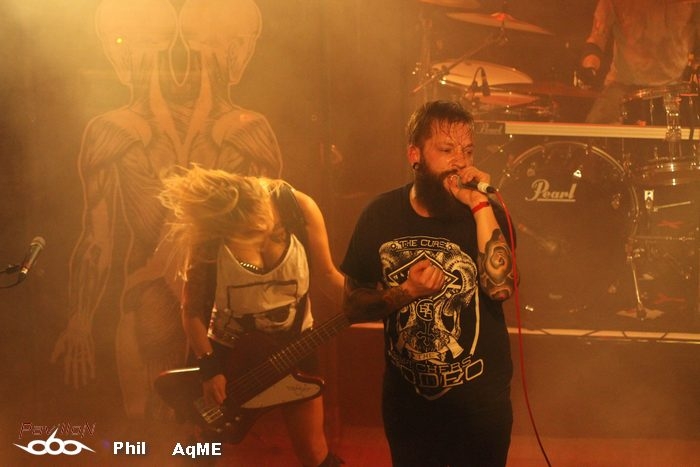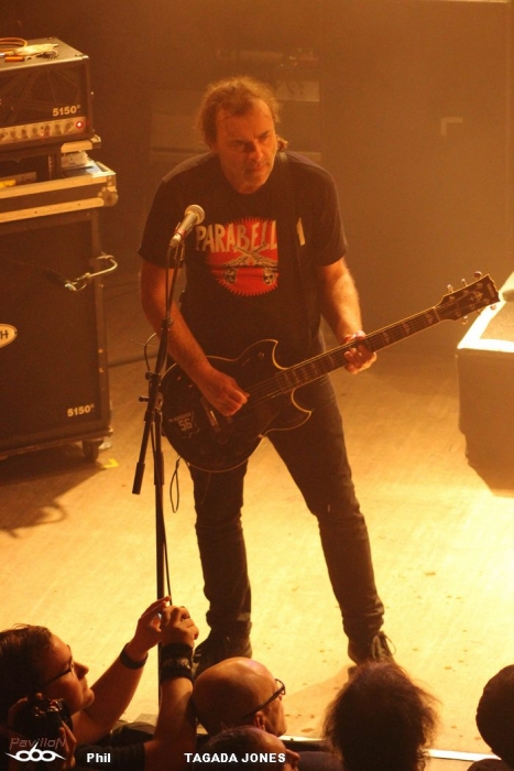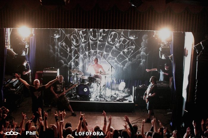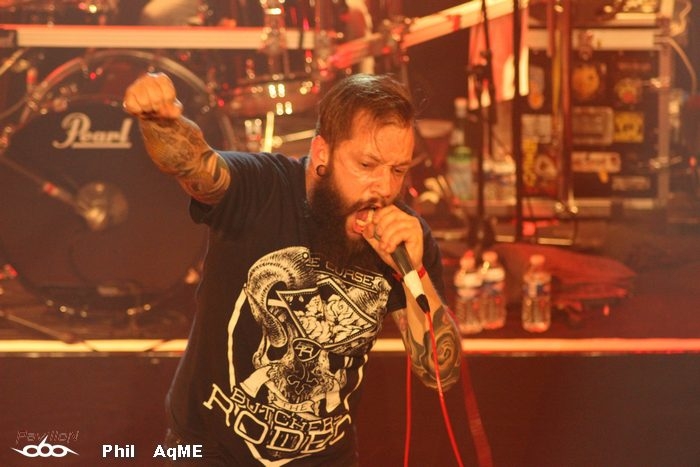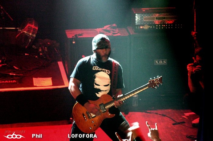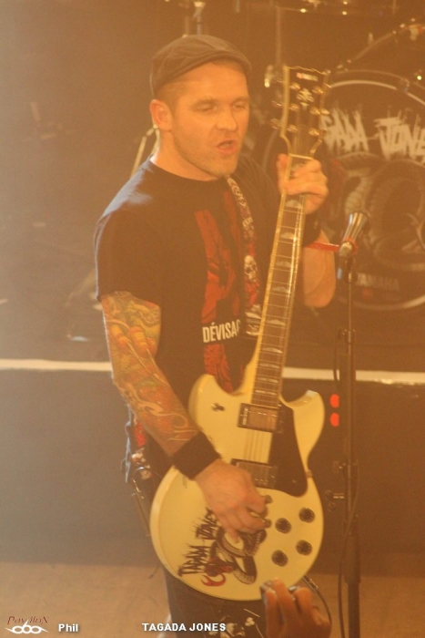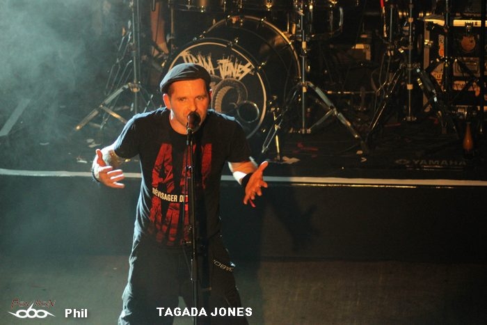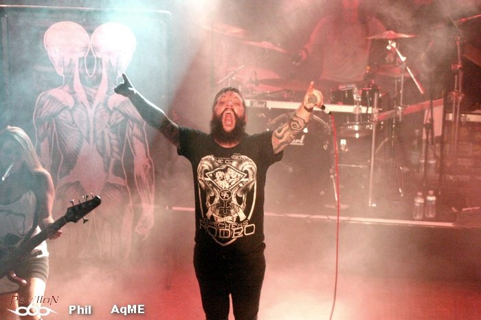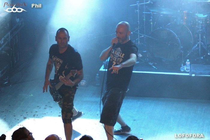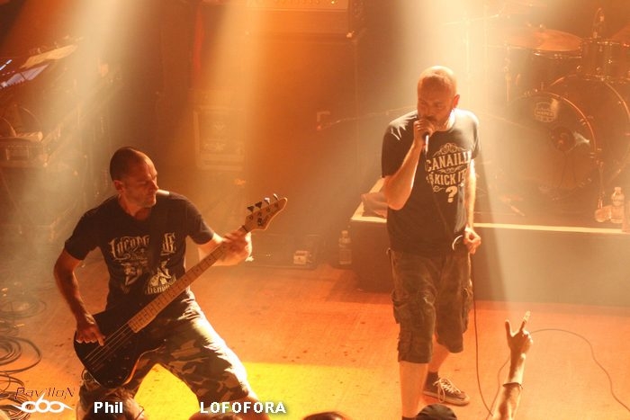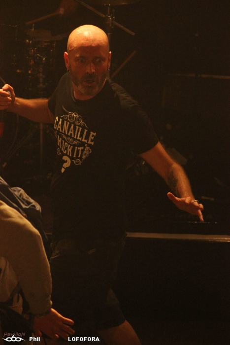 Le début de la soirée voit Aqme ouvrir le bal, le quatuor mené par Vincent permet au groupe de faire honneur à son dernier album en date "Dévisager Dieu" constituant presque la moitié du set. Le vocaliste se démène comme un beau diable, ne faisant pas à l'économie. Par son attitude scénique parfaitement calée et une bonne communication avec le public, Aqme entre en communion avec la fosse et le balcon garnis et fait bouger, pogoter, slammer le Divan du Monde. Les autres membres de la formation sont moins mobiles mais assurent sans failles leur rôle. Pas de doutes, Aqme est en place et paré pour prolonger sa tournée en 2015. Malgré un set relativement court, 45 min, les parisiens ont mis le feu au parquet. Setlist : 01/ Avant le jour 02/ Lourd Sacrifice 03/ Au-delà de l'ombre 04/ Blasphème 05/ Le culte du rien 06/ Enfants de Dieu 07/ Ce que nous sommes 08/ Luxe Assassin 09/ Superstar Je faisais référence au pogo, il y a peu... pourquoi ne pas prolonger la danse avec les bretons de Tagada Jones. Le brasier est maintenu au Divan. Pas de répit, hormis l'échange de scène. Les punk-rockeurs ne font pas dans la dentelle, les musiciens traversent la scène d'un bout à l'autre, viennent aux contacts de la foule et à l'image de Waner (basse) donnent tout ce qu'ils ont dans le corps et dans les manches et baguettes. L'ambiance préparée par Aqme monte encore durant ce set énergique, fougueux telle une formation juvénile. Les rennais prennent du plaisir et cela se transmet dans le globalité de la salle. Rendant hommage à leur ami de longue date, Schultz, Stef (guitare) arbore un tee-shirt à l'effigie du groupe. Nico profite d'instant de communication pour évoquer le nom du frontman disparu. La soirée ne cesse de grimper en intensité tout au long de ce show dédié à "Dissident" paru depuis février dernier. Une heure et quart de stage diving, slam, pogo mais surtout de compositions puissantes, pertinentes dans leurs propos et parfaitement maitrisées par les quatre membres du groupe. Le punk français a encore un bel avenir Setlist : 01/ De L'Amour Et Du Sang 02/ Instinct Sauvage 03/ Le Chaos 04/ Yech'Ed Mat 05/ Descente Aux Enfers 06/ Tout va bien 07/ Zéro De Conduite 08/ Cargo 09/ Vendetta 10/ Dissident 11/ La Traque 12/ Superpunk 13/ Karim & Juliette Le final est à la charge de Lofofora, après ses deux prédécesseurs la formation a du pain sur la planche. La braise ne cesse de rougir, il convient de ne pas faire retomber le soufflé. Aucune crainte avec Reuno et ses compères, le quatuor investit les planches dans le but de continuer à faire vibrer le public. D'entrée de jeu, "L'Oeuf" met la salle en ébullition et ce n'est pas fini. Phil (basse) et Daniel (guitare) déchaînés sans retenues envoient du lourd, riffs et rythmiques imposants. Que dire de Vincent, qui martyrise pour la bonne cause ses fûts et cymbales. Les frappes sont énergiques, précises donnant une assise parfaite et soutenue. Reuno a son habitude est très communicatif, ralliant le public dans à la cause de Lofo dès l'entame du set. Ses parties vocales sont justes, équilibrées malgré la prestation tonique du frontman. "L'Epreuve du Contraire" passe sans difficultés l'épreuve du live et reçoit un accueil chaleureux, le Divan en connaissant tous ses détails. Les pogos, slams... entrepris en début de soirée perdurent tout au long d'un show énergique, maitrisé de Lofo, amusant Reuno et permettant au chanteur de blaguer sur ces mouvements du public. Comme Tagada Jones, Lofofora profite de l'instant pour rendre un hommage à Schultz via "Amsterdam" repris en coeur par la salle. Setlist : 01/ L'Oeuf 02/ Le Fond Et La Forme 03/ Pornolitique 04/ Mémoire De Singes 05/ Trompe la mort 06/ Contre les murs 07/ Utopiste 08/ Élixir 09/ Pyromane 10/ Envie de tuer 11/ Tsarine 12/ Justice 13/ Amsterdam 14/ Double A Lorsque les lumières du Divan du Monde se rallument, l'assistance dégage un large plaisir et semble ravi de cette belle affiche. A son habitude, en offrant un 100% french metal, Oui FM a réussi son pari. Trois belles prestations réalisées au Divan pour cette fin d'année 2014. On espère se revoir en décembre 2015... |