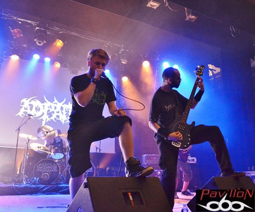 Voici à présent AD PATRES. Groupe de Death Metal aux fondations bien solides bâties par le batteur/fondateur de SETH, des membres d'I.O.S.T., ou encore de WITHDRAWN. Le quintette nous avait déjà offert son premier méfait en 2010 (soigné par Mathieu Pascal/GOROD), une première démo très bien accueillie qui donna suite à un split "Prophecies of The Beheaded", partagé par WRITHING et paru cette année même. Mais à l'heure où j'écris ces lignes, quelques nouvelles viennent de tomber: la sortie du premier album "Scars Aesthetics" (dont quelques extraits nous seront servis au cours du set) est ainsi prévue pour septembre, donnant lieu à une signature toute fraîche chez "Kaotoxin Records".