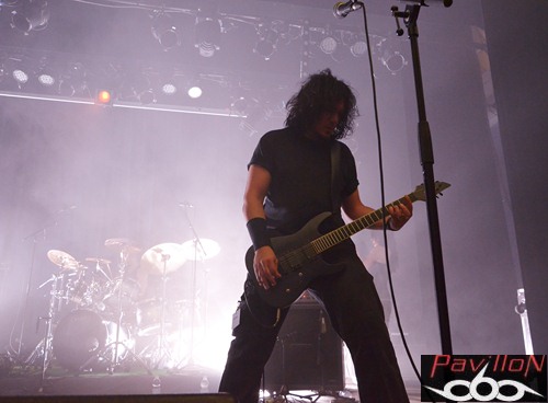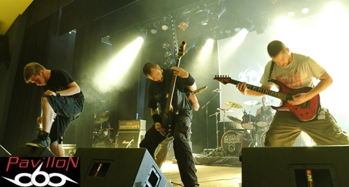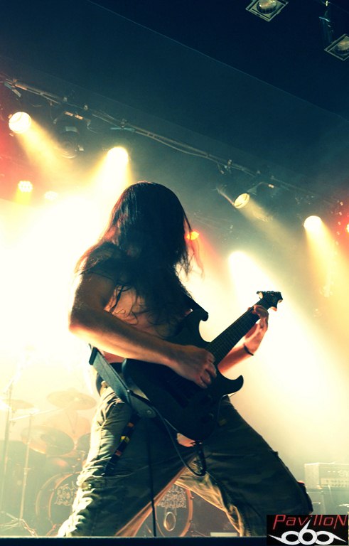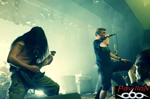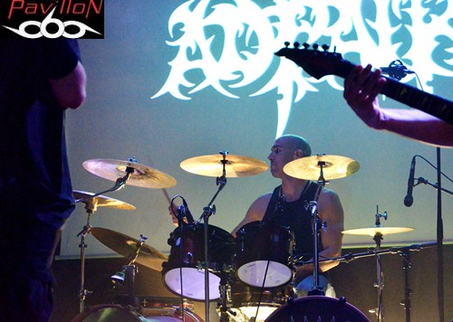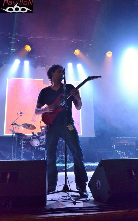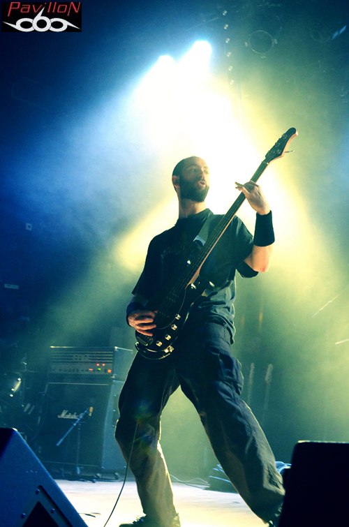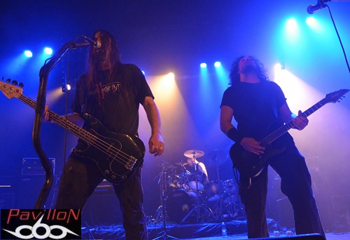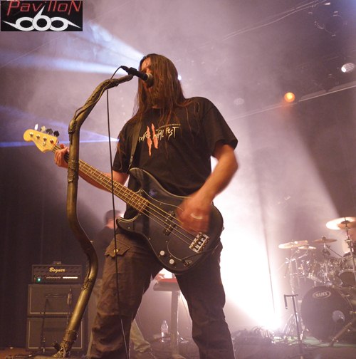 Et au vu de la set-list de ce soir, incluant seulement des nouveaux titres (sauf exception), nous pouvons en déduire que leur absence a été productive. Changeant de concept, après le brainstorming éprouvant de 2010, donnant lieu à des morceaux si bien dé-nommés, l'année 2012 prévoit l'arrivée d'un premier album enregistré au "Aum Studio", disponible prochainement et dont certains titres sont déjà en ligne sur leur site. Alors, ne vous y trompez pas, car sous cette apparente décontraction, se cache un potentiel certain qui ne s'arrête pas seulement en studio. Un jeu sobre mais très efficace nous attend, avec ces quatre musiciens concentrés et bien en place, qui nous octroient déjà un "Selfish figure" en pleine face. Posant ainsi les marques de leur style, la nouvelle fournée de titres vient se mêler à "Prosthetic mind", titre qui apparaissait déjà sur leur premier EP, mais qui a été rebaptisé (et réenregistré) pour apparaître sur leur prochain album. L'ancienne ère et la nouvelle se mêlent donc parfaitement, en alliant des sonorités à la fois complexes, une aura sombre et nostalgique, mélancolique, le tout porté le chant 'double impact' tenu par Romain Presseq et soutenu par Jonas Mille. Les deux guitaristes instaurent ainsi des riffs tranchants et varient les vocaux. Dicté par les coups de baguettes percutants de Jérémy Chabanaux, un registre progressif s'installe, le combo distillant à la fosse un death metal varié, avec des changements et des breaks bien dosés. A l'image d'"Healing springs", qui nous sert des lignes mélodiques, au registre parfois black ou thrashisant, nous plongeant dans une ambiance infernale. Mais le côté 'émotion' n'est pas laissé de côté, entre l'atmosphère libérée et ce chant écorché qui ajoutent de l'âme à tout ça. La partie rythmique, quant à elle, sera rehaussée et assombrie par les cordes d'Aymeric Lach, donnant ainsi un genre à la fois oppressant et bien aéré. Le set se termine sous les applaudissements, devant une salle bien moite. Apparemment les compositions du nouvel album ont prouvé leur efficacité... Rendez-vous pour la sortie de l'album...