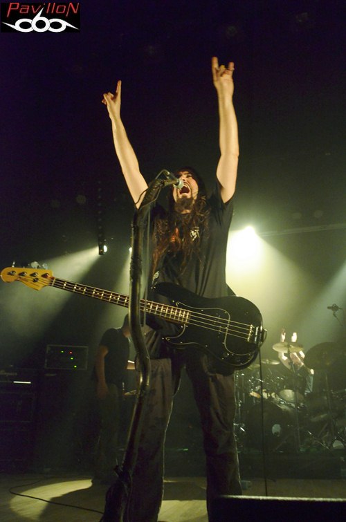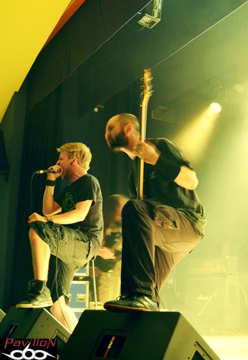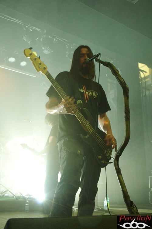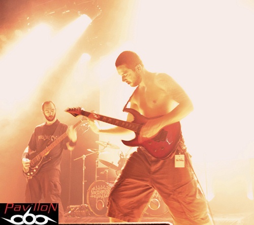 C'est donc avec un set millimétré sous le coude, engagé par "Blood Red Fury", que le combo s'avance, dans une salle bien décidée à se laisser malmener par les secousses djent/thrash/groovy entamées en début du set. Un aspect meshugghien se dégage parfois de leur univers, mais au-delà de l'usage de la polyrythmie, de cet aspect technique et moderne servie généreusement, comme sur "Creepy Generation", il y a également quelque chose de très direct, sauvage, voire tribal, quelques qualificatifs qui prennent leur sens sur scène. C'est donc l'endroit parfait pour envoyer un power/thrash frénétique en ouverture, ou encore un "Fits of Rage" en acier trempé, amené par des rythmiques ultra-nerveuses et autres slaping groovy de Mathieu Gervreaux. Le tempo et les ambiances se font changeants, plus lourds sur "Skulls in a River Bed", avec des plans qui s'infiltrent de manière vicieuse dans votre canal auditif en laissant tout de même s'échapper quelques moments de répit, grâce aux vocaux plus aériens libérés ici. Mais l'instinct primal reprend vite le dessus et Khris renforce aussitôt le ton avec son chant brut qui reste omniprésent, formant un bloc d'agressivité bien contrôlé. Ils sont quatre, et il n'y a pas besoin de plus, quand on assiste aux plans et soli barrés maîtrisés par Denis Cornadeau sur le thrashisant "Adversity and Love", on se dit qu'un guitariste suffit, parfois, pour asseoir le public. Les roulements ravageurs de Simon Renault marquent déjà l'arrivée du titre éponyme, le batteur guidant le reste de la troupe vers un mid tempo particulièrement efficace avant de repartir sur un terrain rythmique plus hostile. Et la fosse sera une fois de plus prise à partie pour retourner la salle. Le défouloir du vendredi est ouvert! "I Fuckin' I" viendra pousser les spectateurs dans leurs derniers retranchements, en encaissant ces dernières minutes d'accélération destructrices. Les derniers pogos et headbang se font et se défont pour laisser place à des applaudissements, pour la sortie de l'avant-dernier groupe de la soirée...