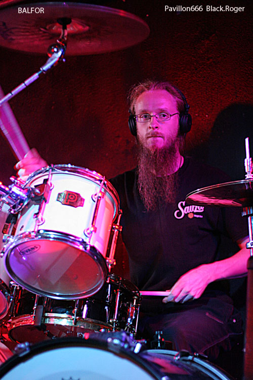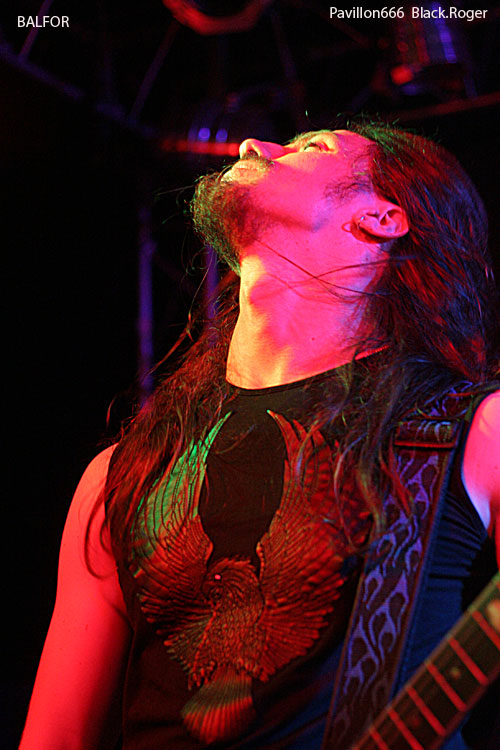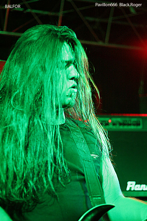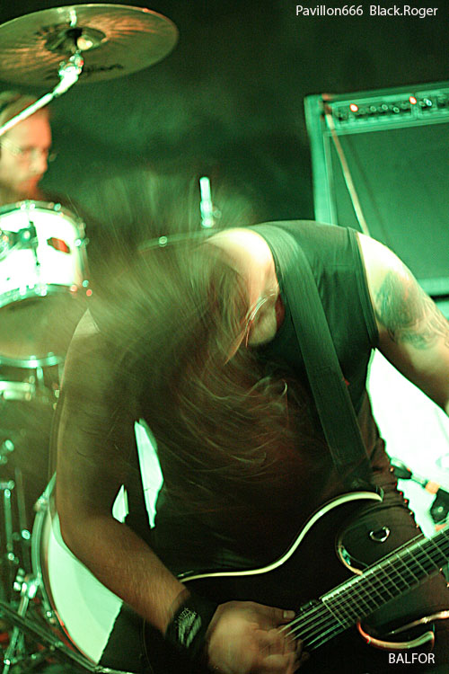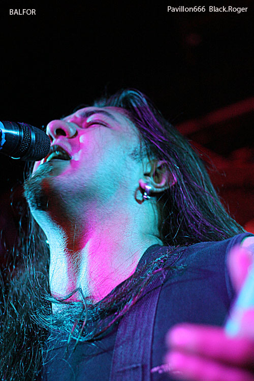 Enfin, les Ukrainiens de BALFOR, privés de leur bassiste, s'installent, pressés, semble-t-il, de montrer de quoi ils sont capables. Ce combo originaire de Kiev pratique depuis 1997 un "black metal barbare". Ce soir, on a droit à un set de black death honorable, mais on peut simplement regretter que le son de la batterie engloutit par moments celui des guitares et la voix du chanteur. La première phase de leur prestation me semble un peu trop linéaire, presque monotone. Heureusement, après quelques mots de présentation en anglais, sans doute agréables pour l'auditoire ou ce qu'il en reste, le jeu du trio de BALFOR devient plus varié, plus rythmé, plus mélodieux...et brusquement - mais ce n'est pas vraiment une surprise -, ils renoncent après avoir interprété quatre chansons seulement ! Qu'ils ont l'air désabusé, ces trois garçons venus de l'Est ! Comme nous, ils ne savent pas si leur musique a plu à la douzaine de personnes encore présentes entre le bar et la scène. Comme nous, ils ont certainement été choqués, pour ne pas dire plus, par le comportement de certains qui ne daignent pas regagner la salle quand un groupe de leur niveau vient jouer pour une seule date dans une grande ville de France. Les publics d'Europe Centrale ont plus d'éducation, on a pu le vérifier, lors de festivals par exemple.