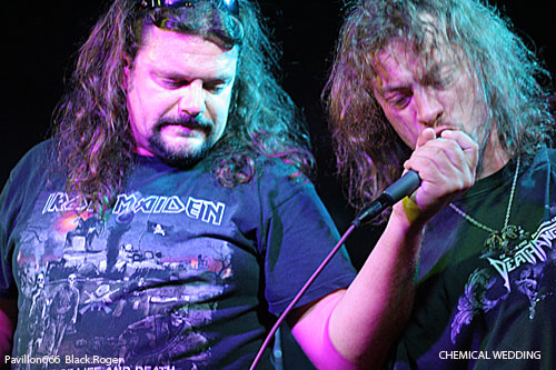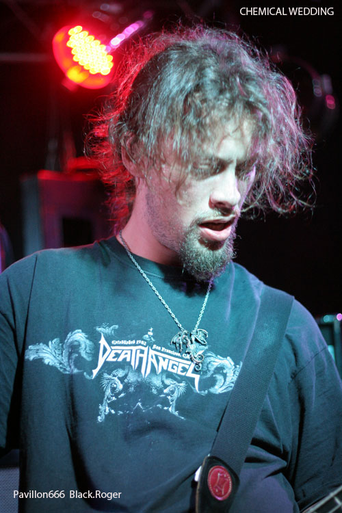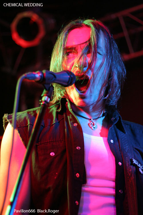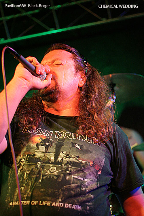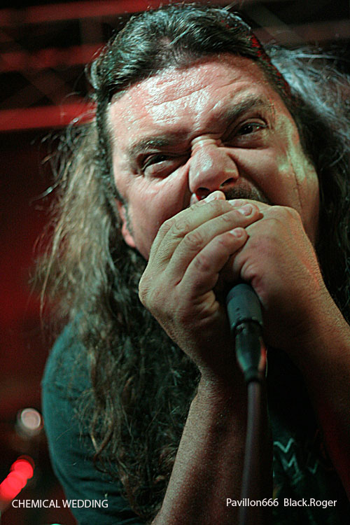 Une longue, trop longue, pause et ce sont les Dauphinois du groupe de stoner metal, formé en 2006,CHEMICAL WEDDING, cinq musiciens dont un claviériste, qui vont, sous la houlette de leur chanteur Eric, un homme qui en impose, se produire maintenant, pour la première fois à Lyon. Vous l'aurez deviné, ce sont des fans d'IRON MAIDEN, puisque le nom de leur formation vient du titre de l'album de Bruce Dickinson, publié en 1998. CHEMICAL WEDDING pratique un hardrock, orientation "stoner", de bonne facture, la batterie est puissante, elle envoie comme des coups de canon percutants, le chant bien au point et la voix juste, seul le clavier reste à peine audible. Mais l'ensemble est harmonieux, parfois sombre, finalement assez agréable à écouter. Espérons que les Grenoblois ne garderont pas un souvenir trop négatif de leur passage au Lyon's Hall.