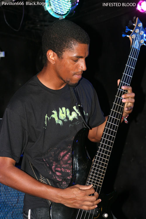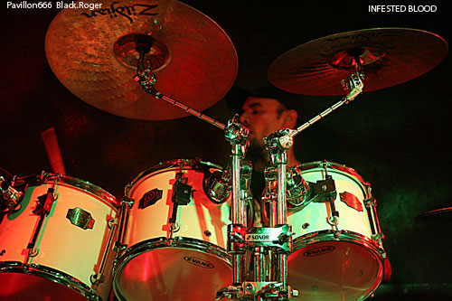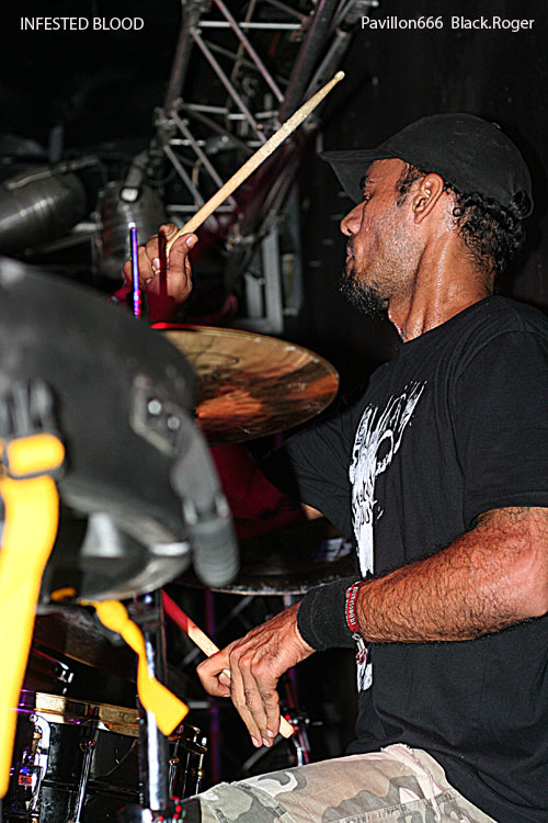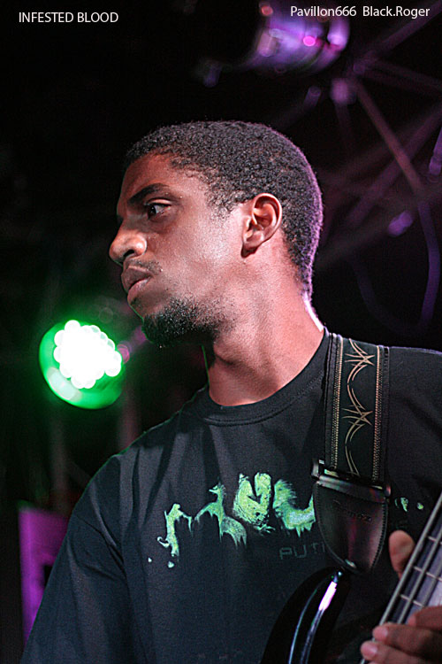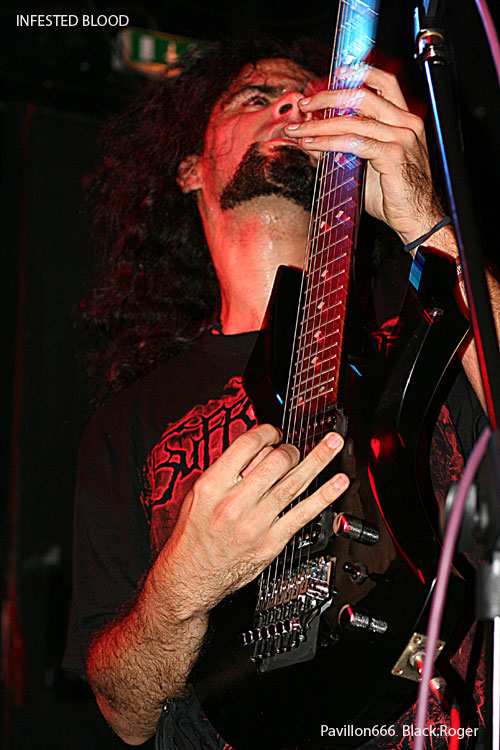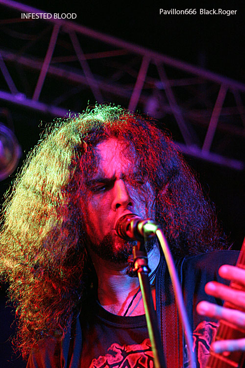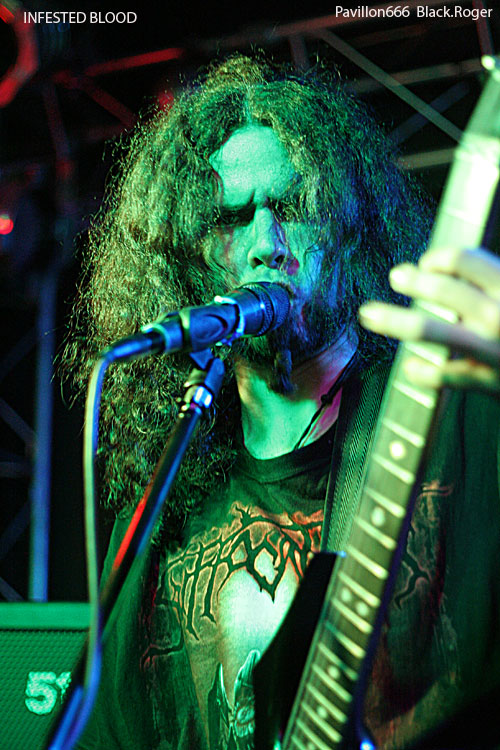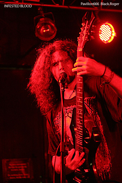 A minuit, les Brésiliens du groupe INFESTED BLOOD (fondé en 1999 dans le Nord-Est ou Nordeste), commencent à jouer devant une poignée de spectateurs. Connus et reconnus dans le milieu du Brutal Death, ils participent à une longue tournée européenne. Ils sont trois, un trio sympathique au contact facile et agréable, il faut le souligner. Diego, le chanteur, déclare: "It's a great pleasure to be here tonight!".Le pense-t-il vraiment? Leur musique ne déçoit pas, elle est puissante, brutale avec des riffs bien sentis. Mais les circonstances font que nos amis du Brésil ne s'agitent pas trop sur scène, le chanteur Diego s'adresse à plusieurs reprises à chacun...30 secondes de pogo avec trois ou quatre costauds, sans doute frustrés. On imagine INFESTED BLOOD dans une grande salle comble, ou dans un festival. Ce soir, avec beaucoup de mérite, le trio brésilien a fait son travail. On espère sincèrement qu'ils reviendront prochainement en France. Ce sont des artistes attachants et talentueux.