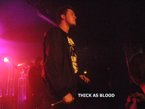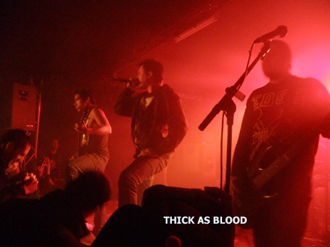 Ensuite, c’est aux hargneux de THICK AS BLOOD de monter sur scène, avec un problème de taille puisque leur chanteur est resté bloqué aux Etats-Unis et qu’il s’agit ce soir d’un remplaçant. Force est de constater que le hurleur de ce soir est à l’aise dans ce rôle de frontman, et que malgré ces désagréments, les musiciens restent bien carrés. Autrement dit, leur Hardcore bourrin fait mouche, pour preuve la fosse est nettement plus excitée que pour le groupe précédent. Certaines personnes connaissent visiblement les textes de la formation et vocifèrent en chœur avec elle. Un set sans surprise, terriblement carré, mais il manque malgré tout un peu d’originalité à nos américains pour vraiment convaincre.