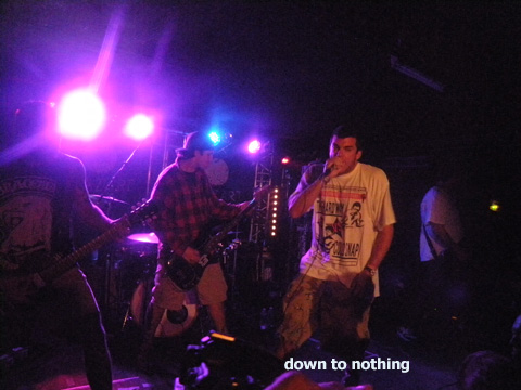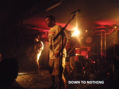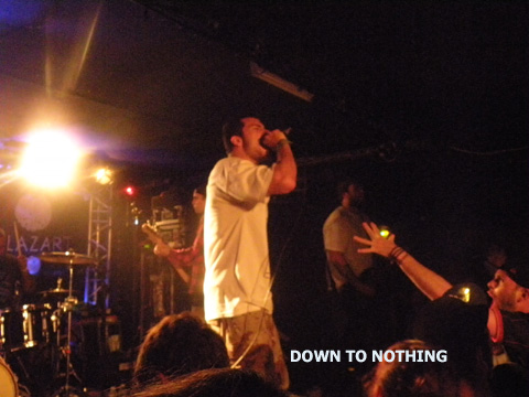 « Mais… serait-ce bien lui ? Et bien oui, sacré lascar ». C’est à peu prêt ce que votre serviteur s’est dit lorsqu’il vit David Wood monter sur scène. Pour l’anecdote, à chaque fois que je vois cet individu, il fait systématiquement deux concerts dans la soirée. La dernière fois il avait été le même soir le chanteur remplaçant de BORN FROM PAIN et le bassiste de TERROR. Aujourd’hui, nous découvrons DOWN TO NOTHING la formation dont il est le chanteur. Indéniablement cet individu est fascinant, hyperactif comme à son habitude et bouge dans tous les sens. Le reste de la formation est tout aussi efficace, mais il est hallucinant, après coup de se dire que l’on ne se souvient pas véritablement des musiciens, mais seulement de David Wood, dont l’efficacité et la présence relèvent de la fascination.