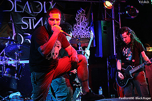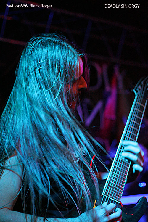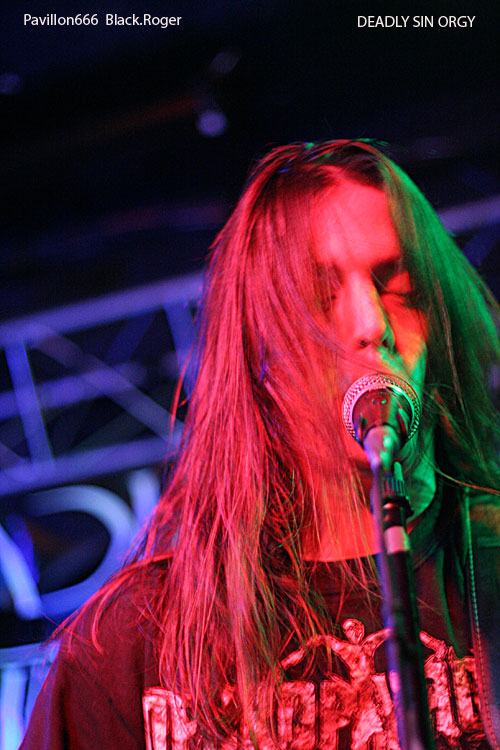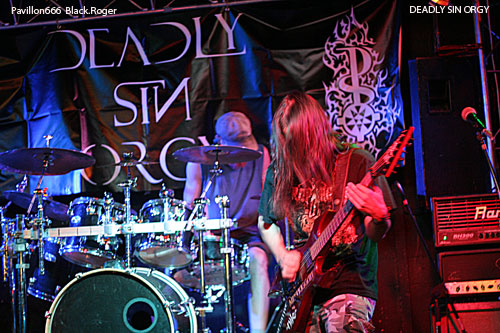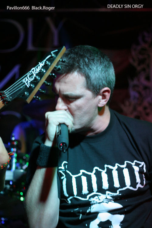 Seconde formation invitée de la soirée, DEADLY SIN ORGY de Versoix (Suisse), va nous balancer du pro, du consistant, de l’extrême comme on l’aime pendant un bon moment. Le frontman et le bassiste vont occuper la place laissée libre devant la scène par un public absent. Malgré tout le groupe va déverser son flot de death/black/grind sans discontinuer comme si il jouait devant des fans déchainés. Les envois sont énormes boostés par une batterie très présente, précise et inventive Les « gratteux » ne sont pas des manches, entre riffs puissants et soli torturés, on nous accroche bien les conduits auditifs avec en fond d’écran une basse dont les lignes sont rondes et soutenues Bref, le combo avec son frontman très actif et enragé nous fait apprécier des compositions bien structurées et variées C’est carré et bien envoyé, on apprécie et on découvre en même temps avec plaisir ce quintette venant de la Suisse voisine.