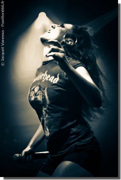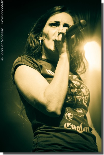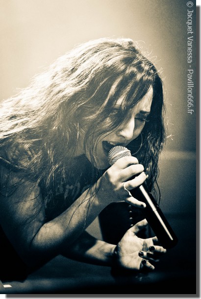 Fin du set de REVAMP, quelques spectateurs sortent de la salle direction le bar, et c’est à ce moment là que je réussie à me frayer un chemin jusqu’au « photo pit », après une lutte acharnée pour arriver devant la scène (puisque oui, ce soir la laiterie est réellement blindée). Il est temps pour KELLS, groupe français, de ‘neo metal symphonique’ de prendre place sur les planches. Ni d’une ni deux, le groupe démarre fort, le son est plutôt bon, et la chanteuse semble en grande forme ce soir. Malgré une musique assez classique et bien néo metal, qui à vrai dire n’est pas réellement ma tasse de thé, le set aura été carré, bien menée, sans grande fausse note. Virginie, la chanteuse, saute, headbang, dans tous les sens, descend de la scène pour se placer dans le photo pit et taper les mains des quelques ‘fan’ prostrés devant les barrières. Du début à la fin ils n’auront pas perdu en intensité, délivrant un set bien plus qu’honorable !