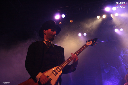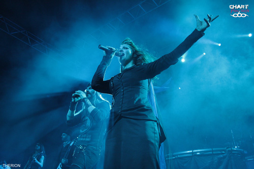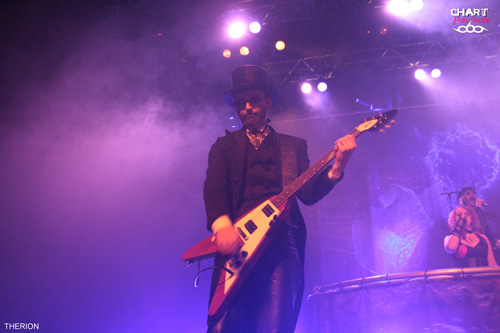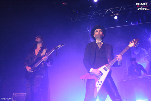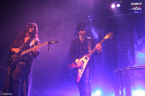 THERION pour ceux qui ne les connaissent pas ou qui l’aurait oublié est le genre de groupe qui s’est construit au fil du temps pour arriver à un niveau musical pour le moins éloigné de ses débuts. Le groupe avait débuté sa carrière avec un death metal pas forcément novateur avant de s’enrichir de parties de plus en plus orchestrées, d’incorporer des chants lyriques et d’arriver au résultat que l’on connait aujourd’hui. THERION a absolument tout ce qu’il faut pour réunir un public très large. Pourtant, sa notoriété reste malgré tout modeste même si son public est pour le moins éclectique et de tous les âges. Le groupe a évolué aussi visuellement et pour ceux qui comme moi, les ont connus à leur débuts et ne les ont pas vus depuis une dizaine d’année. Ceux-ci constateront une grande différence visuelle. C’est un nouveau groupe qui se présente à vous sur cette tournée. Un nouveau bassiste, un nouveau batteur et un nouveau guitariste, rien que ça, qui ont été recrutés par JOHNSSON. Celui-ci a depuis un certain temps abandonné le chant pour le laisser à deux chanteurs lead. Son style a évolué lui aussi. Fini les cheveux longs et l’attitude metal du frontman. On est passé de quelque chose proche du death metalleux suédois à une sorte d’aristocrate anglais du XIXe siècle. Mais visuellement, cela fonctionne plutôt bien. C’est tout le groupe qui se présente en tenu de scène ce qui permet une grande cohésion. En effet, les poses, les attitudes des membres du groupe semblent répétées et longuement travaillées. C’est regrettable car tout cela manque un peu de spontanéité. Seule exception du côté du bassiste qui lui semble débarqué un peu de nulle part, restant dans son coin et secouant la tête du début à la fin du concert. Mais musicalement, le groupe est impeccable. Le son est d’une rare propreté. La puissance qui se dégage de ces guitares est exceptionnelle.