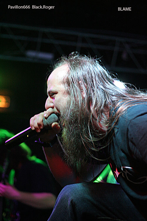 Pour conclure, ce seront les Vosgiens de BLAME qui vont se charger de nous défoncer les neurones, du moins nous l’espérons. Dès le départ la barre est placée bien haute, ça déménage sur scène et le chanteur/frontman Jean, en fait des tonnes. Il a bien « mouillé la meule » et s’en vante. Je suis « bourré » répète-t-il régulièrement, mais cela ne l’empêche pas d’assurer et d’assumer son rôle provocant et dérangeant, c’est tout un poème dirons-nous. Mais attention, ses acolytes ne sont pas venus là pour rigoler, le son est énorme, les envois rapides et puissants, bref on reçoit une claque en pleine figure avec un certain mélange de brutalité et de technicité.