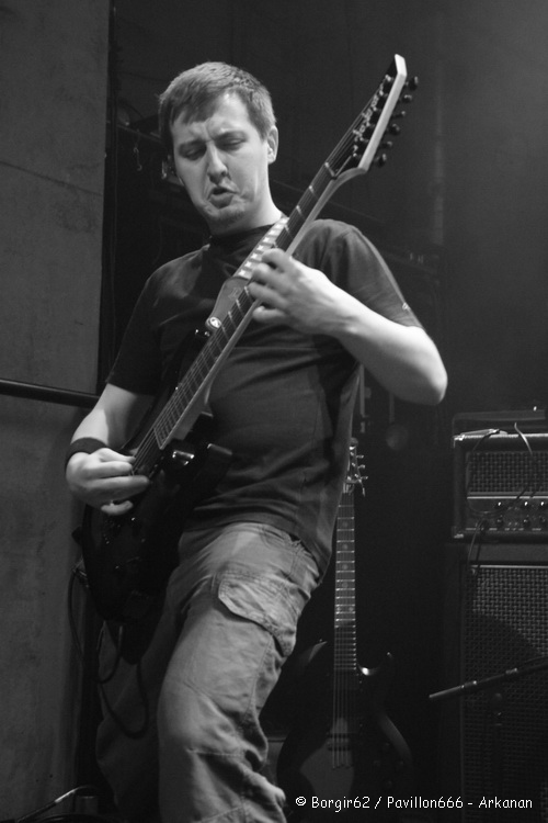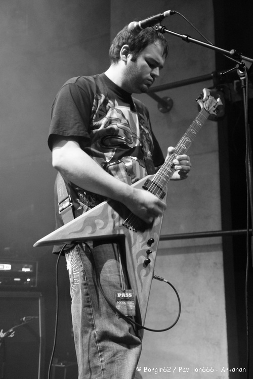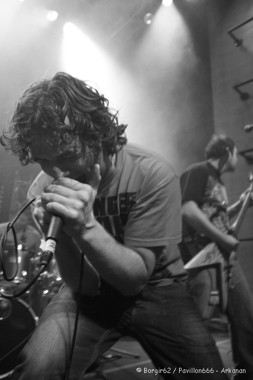 Arrivé sur les lieux sur les coups de 17h30, je patiente tranquillement et constate agréablement que le public arrive en masse pour une ouverture des portes prévues vers 18h00. La salle est déjà bien remplie lorsque ARKANAN arrive pour chauffer doucement mais surement le public. Il ne leur faudra qu’une petite chanson « Riverside » pour que le combo Harnésien mette le public dans sa poche. Personnellement, j’ai eu l’occasion de voir Arkanan à de nombreuses reprises cette année, et, à chaque fois, je les ai vus mettre le feu à la fosse. Néanmoins, j’émettrai toujours la même critique les concernant, à savoir un certain manque de prestance de Julien et Antooney aux guitares, qui restent campés sur leur position (surtout le premier cité, puisque le second commence peu à peu à se bouger). Tout le mérite en revient donc à Bouba (à la basse) et Tom (au chant) qui n’hésitent pas à faire bouger le public et à courir et jumper un peu partout sur scène. Le groupe gagne en maturité semaine après semaine et ça ressent sur scène. Un show bien orchestré, une communication active avec le public, il n’en faut pas plus pour mettre en jambes le public, surtout avec des « classiques » comme « Die », « Here Watch Out » ou « Apathetic Body » qui ont toujours le don de dynamiser les spectateurs. Ces derniers auront même le droit à 2 inédits, « From Disaster Place » et « When It Comes » qui figureront sur le prochain album du groupe, qui paraîtra en principe fin 2011. On leur souhaite d’ici-là d’accroître leur public, qu’ils parviennent à s’expatrier un peu hors Nord-Pas-De-Calais, et de multiplier les grosses dates.