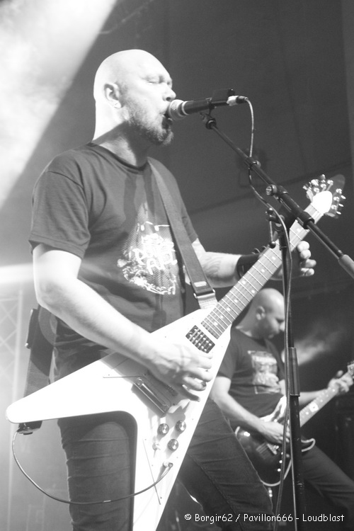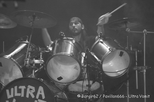 Arrive alors ceux que je croyais voir en tête d’affiche, à savoir Loudblast. Il y avait en fait deux raisons pour les voir en tête d’affiche. Tout d’abord : Loudblast ! Comment Loudblast peut-il se retrouver à jouer avant Ultra Vomit, surtout quand on sait que Loudblast joue à domicile ? Et surtout, Hervé vient à peine de terminer son set avec BBA, et malgré tout le respect qu’il mérite, je ne le voyais pas assurer un deuxième set juste derrière. Le comportement du public change légèrement, et les plus expérimentés seront les vrais chauffeurs de salle. Les trentenaires et quadragénaires (voire plus) prennent la place des jeunes et mettent un beau bordel. Il faut dire qu’avec le nombre de date qu’ils font dans le coin, ça en devient presque une grande réunion de famille, où l’on retrouve toujours les mêmes personnes. Les vétérans de l’affiche sont toujours aussi souriants sur scène, et leur show est on ne peut plus carré. Alex ou Drakhian, bien qu’un peu plus en retrait par rapport à Stéphane Buriez, se font plaisir sur scène et enchaînent les plus grands morceaux avec le sourire aux lèvres. Il ne faut que quelques minutes pour que l’ensemble du public s’allie à la cause de LB et les fans n’hésitent pas à emmener les néophytes au cœur des pogos. Loudblast s’appuie également sur des tubes comme « Sublime Dementia », « My Last Journey », « No Tears To Share » ou « Taste Me ». Aux fûts, Hervé qui vient donc de jouer avec BBA aurait pu légitimement avoir une baisse de régime, mais non, il tient la cadence et nous assure un très bon spectacle ! Le public ne s’y trompe pas et l’applaudit lui et l’ensemble du groupe lorsque les dernières notes de « My Last Journey » résonnent.