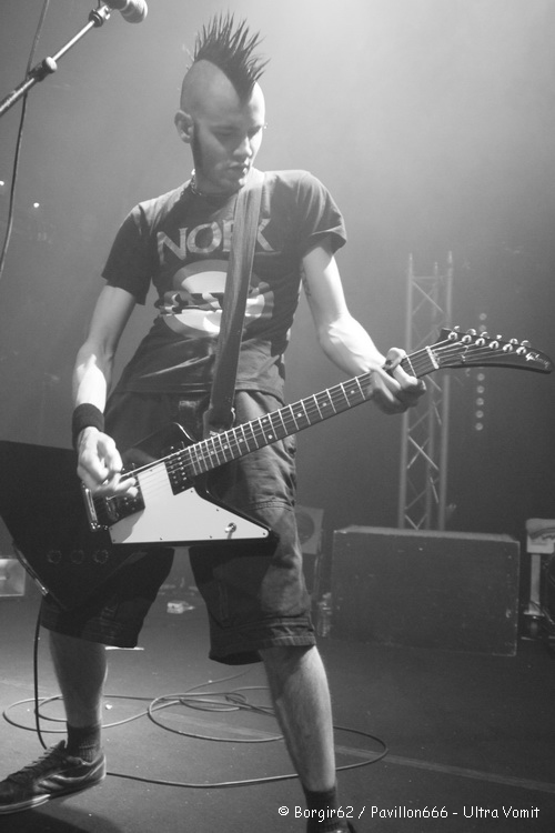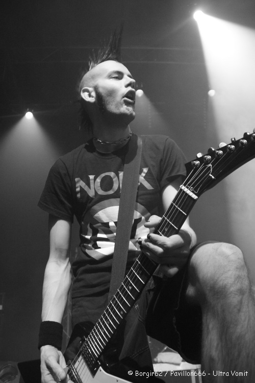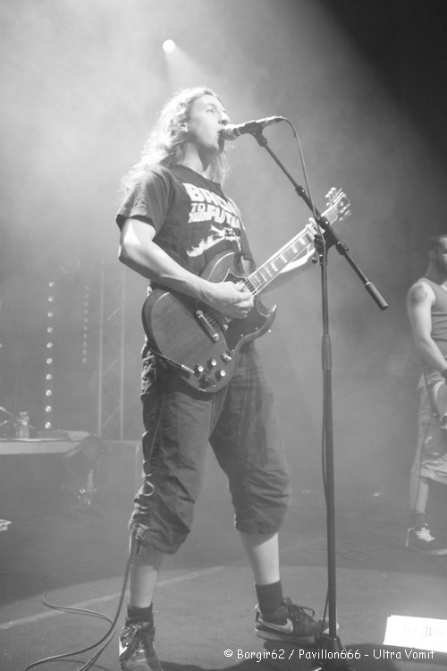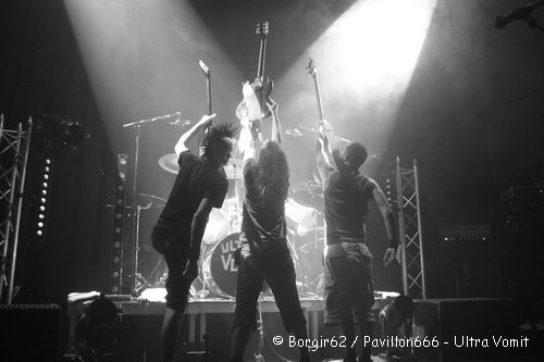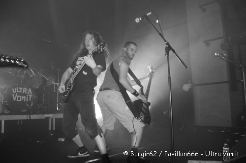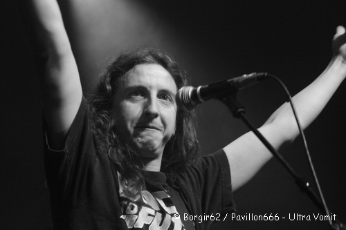 Ultra Vomit prend alors place sur scène, et le spectacle démarre. Pas de rythme, le chant n’est pas audible à cause de micros non branchés, et la basse peine à se faire entendre pendant quelques minutes, notamment quand la batterie se fait entendre… Mais l’attitude du groupe fait passer ça au second plan. Blagues balancées à tout va, éclats de rire, quelques mots glissés à l’attention du public, les balances sont à elles seules tout un spectacle. Mais le vrai spectacle démarre quand Motörhead est parodié. « Quand J’étais Petit » plonge le public dans une ambiance des plus détendues, et ça continuera avec des hommages rendus sur « Darry Cowl Chamber », « Mountains Of Maths » et « Calojira ». Les textes sans aucun sens sont repris par une grosse partie de la salle, qui apprécie la bonne humeur dégagée par les nantais. Néanmoins, nous sommes tout de même dans un concert metal, et quelques pogos prennent place mais sans nettement moins suivis que lors des précédents groupes. Le public s’intéresse davantage au comportement des humoristes qui arpentent la scène et sautent un peu partout. L’humour est à l’honneur et un mini sketch avec l’ingénieur-son introduit même « Pauv’Connard ». Des sourires ornent les visages des centaines de spectateurs présents ce soir qui font de ce concert une vraie réussite. Et c’est avec leur hymne, consacré aux canards ; vivants de préférence ; que Ultra Vomit referme cette première édition de l’Agony Fest, applaudis par un public qui, je le répète, était ravis.