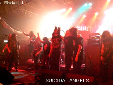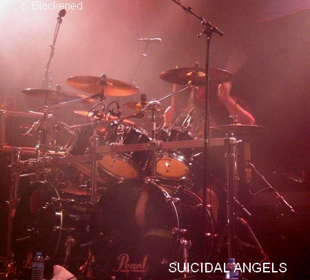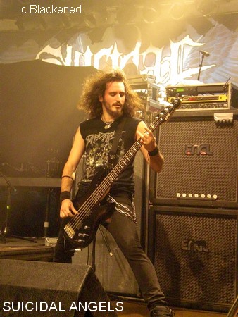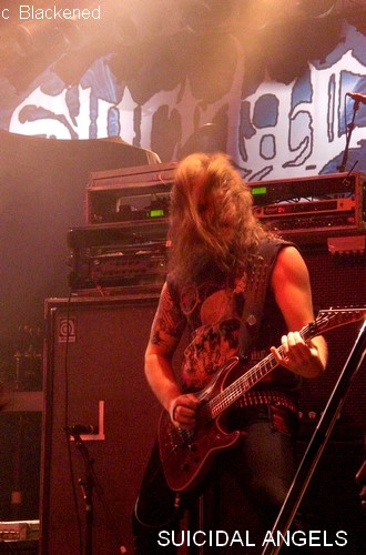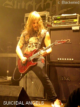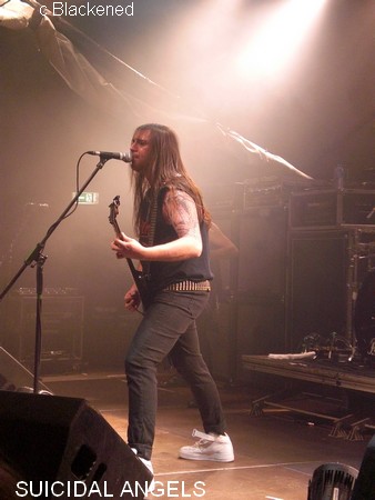 Il n’est pas encore 18h30 quand SUICIDAL ANGELS foule pour la première fois de sa carrière les planches de la grande salle du Garage puisque j’arrive peu après le début de leur set. Le quartet grec est parfait pour ouvrir puisque ses compositions old-school assènent les oreilles des fans venus en masse participer à la fête (environ 1000 personnes ce soir). La fosse, un peu froide au départ, se bouge de plus en plus au fur et à mesure des assauts venus de la scène. S’enchaînent des titres comme "Bleeding Holocaust", "Violent Abuse", "Final Dawn" ou "Beggar Of Scorn", qui prouvent la qualité du dernier opus en date des thrashers « Dead Again ». "Apokathilosis", ou "…Lies" représentent eux leur effort précédent paru en 2009. Riffs assassins et rapides, soli ravageurs, le headbang de rigueur et les premiers pogos se font voir. Le groupe remercie leurs aînés de les avoir accueillis sur cette tournée, et invite une dizaine de personnes sur scène à remuer les cheveux sur leur dernier titre de la soirée. Les fans du groupe étaient aux anges, et ceux qui ne les connaissaient ont pris à mon avis une bonne claque ! La soirée débute sous les meilleurs auspices.