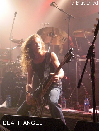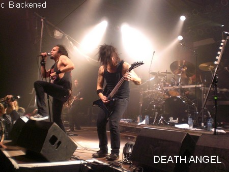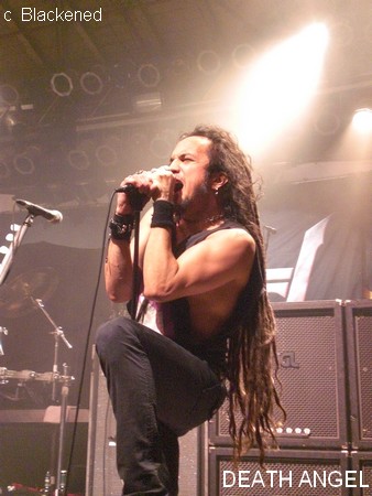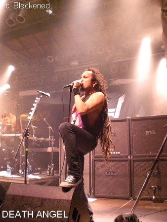 Je rencontre avec plaisir un camarade de jeu (membre d’un autre webzine metal français) venu assister à l’évènement, mais je n’ai pas beaucoup le temps d’apprécier les retrouvailles puisque le changement de plateau est très court (guère plus d’un quart d’heure) : les Californiens de DEATH ANGEL investissent les lieux à l’heure de l’apéro. Mark Osegueda est déchaîné, hurle sa rage et agite ses immenses dreads dont le souffle atteint les premiers rangs. Le son au plus près de la scène n’est pas génialissime, et la voix est un peu recouverte par les guitares et la basse, de même que la grosse caisse. Cette remarque se généralisera malheureusement tout au long de la soirée. Les Californiens, au line-up remanié depuis peu, puisque bassiste et batteur sont partis s’occuper de leur famille, sont au top de leur forme. Les nouveaux venus, des non-philippins cette fois-ci, sont parfaitement intégrés au sein de la formation. Damien Sissom n’hésite pas à orner certaines de ses parties de wha-wha, et Will Caroll derrière les fûts assomme ses peaux jusqu’à briser une baguette en deux. Les titres dévastateurs s’enchaînent. Le groupe met largement en avant son dernier opus en date « Relentless Retribution » puisque pas moins de quatre titres en sont issus. "I Chose The Sky", avec son refrain fantastique, est d’une efficacité démoniaque en live, de même que "Claws In So Deep" et son break qui martèle les tympans. D’autre part "River Of Rapture", single de ce dernier album, prend de l’ampleur sur scène. La rythmique de Ted Aguilar est lourde et carrée, et les soli fantasques de l’agité Rob Cavestany suscitent l’admiration des amateurs. Quel concert ! La tension monte au fur et à mesure du show jusqu’à atteindre des sommets en fin de set. Death Angel est bel et bien de retour, et nous le prouve au cours de trois bons quarts d’heure précis, puissants et redoutablement efficaces ! La passion les anime toujours autant, et les « petits nouveaux » s’en tirent avec les honneurs ! Une bonne grosse claque les enfants !