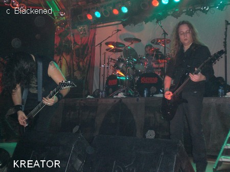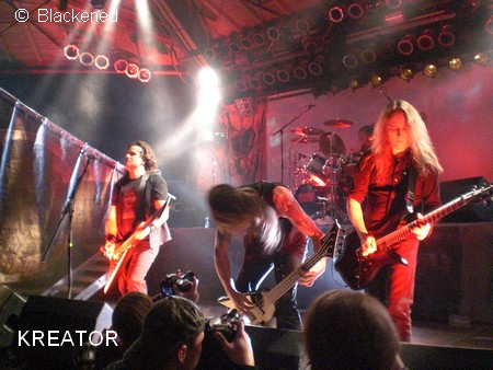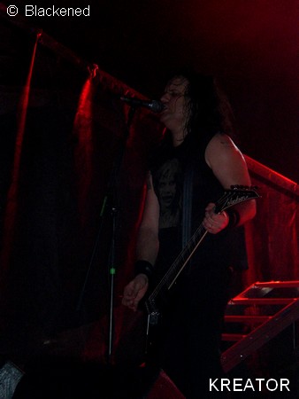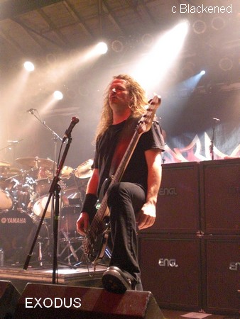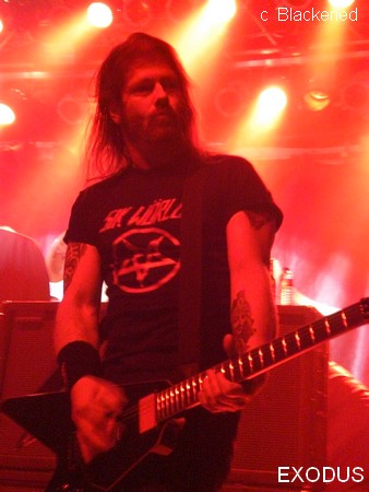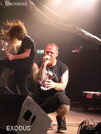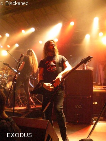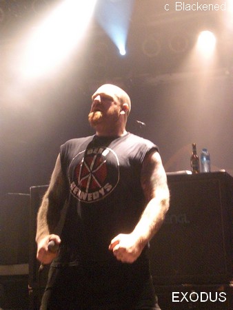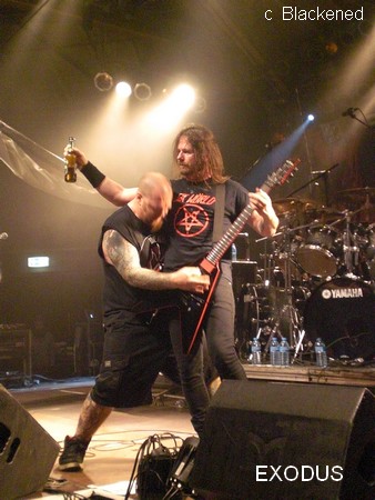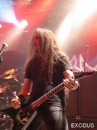 Un nouveau quart d’heure de changement de plateau et c’est au tour du deuxième groupe représentant la Bay Area de monter sur scène. L’intro langoureuse de "The Ballad Of Leonard And Charles" retentit et Gary Holt envoie le premier riff du set d’EXODUS. S’enchaîne directement le second titre du dernier opus en date du quintet « Exibit B : The Human Condition » : "Beyond The Pale". Les Américains, envoient au public allemand (parsemé de quelques Français) une véritable avalanche de pur Thrash durant une bonne heure. Que du bonheur pour les fans présents dans la salle. Rob Dukes hurle sa rage et entre littéralement en transe lorsqu’il œuvre pour le groupe. Comme à son habitude, il ne tient pas en place, explorant la scène sous toutes ses coutures en la parsemant d’énormes crachats. Le frontman assure le show à lui tout seul, même si ses comparses ne sont pas en reste. Gary Holt virevolte sur son manche et arrache presque son vibrato en portant sa guitare au dessus de sa tête avec la seule aide de cette barrette. Ses grimaces constantes contrastent avec la rigueur de Jack Gibson qui tient fermement sa basse en headbanguant de ses rousses boucles. "Another Lesson In Violence", véritable hymne du thrash résonne très tôt dans la set-list, puisque ce n’est que le troisième morceau. Le public est déjà furieux et "Blacklist" achève quelques gorges sous la sollicitation de Dukes. Et ce n’est pas "Bonded By Blood" qui suit directement qui va calmer les adeptes de lysopaïne, ni un énorme "Deathamphetamine" suivi de "War Is My Shepard". La violence atteint son paroxysme avec un petit retour à « Fabulous Disaster » : la longue "Toxic Waltz" déchaîne la fosse. Comme d’habitude, les rythmiques et les soli de la paire Holt / Altus sont impeccables, de même que la frappe sèche et précise d’un Tom Hunting toujours au top de sa forme. Exodus est vraiment un groupe d’exception, qui délivre un thrash brut de décoffrage et reconnaissable entre mille ! Les performances du groupe en live sont énormes, et le combo californien nous le prouve une fois de plus ce soir. La soirée n’a fait que monter en puissance jusqu’ici. Exodus a littéralement retourné la fosse par ses hymnes tranchants et quitte la scène après une bonne heure de sueur. Le rouleau compresseur est passé et a assommé Saarbrücken. On aurait bien voulu un peu plus, et on regrette l’absence de titres comme "Downfall" ou "Riot Act", mais Kreator attend son heure. Le combo allemand, s’il ne réussira pas à atteindre l’intensité, ni sur scène, ni dans la fosse, de leur prédécesseur, va offrir une prestation tout à fait honorable.