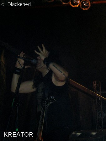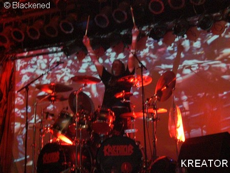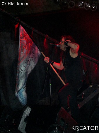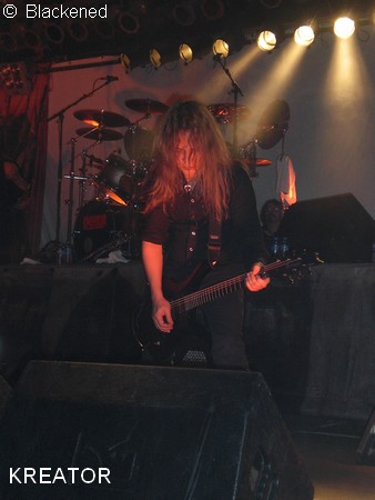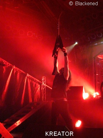 Après un changement de plateau un peu plus long, la faute à une installation d’un décor volumineux (plateforme surélevée autour de la batterie avec escaliers de part et d’autre pour accéder à cette rampe, écran géant en toile de fond, grands draps pour fermer les côtés de scène), l’extinction de feux s’accompagne d’un film projeté sur la grande toile retraçant le début de soirée du Thrash Fest, du tour-bus aux loges où on aperçoit les gars de Death Angel. Filmé en mode « amateur », cette sympathique petite introduction fait monter la température jusqu’au retentissement de la courte instrumentale "The Patriarch", dont la mélodie est reprise à plein poumons par les fans, qui annonce une excellente "Violent Revolution" après l’entrée en scène de KREATOR. Le groupe joue pratiquement à domicile, puisque Saarbrücken n’est situé qu’à 300 km d’Essen, ville d’origine des thrasheurs de la Ruhr. Mille Petrozza, qui a pris quelques kilos, est très en voix. Sami Yli Sirniö, l’autre six-cordiste du combo, exécute ses plans à la perfection, mais d’une manière un peu scolaire. Son jeu de scène très mou contraste avec la déferlante de thrash que propose Kreator : "Hordes Of Chaos" titre éponyme du dernier album en date du groupe assomme la fosse, enchaîné directement avec un prévisible mais toujours aussi puissant "Phobia". Christian Giesler remue ses cheveux et ruine son dos, Mille monte régulièrement sur la plateforme surélevée pour chanter auprès des micros piqués de part et d’autre du kit de Jürgen Reil, qui fait un parcours sans faute ce soir. Malgré quelques problèmes de floyd (la barrette du vibrato se faisant la malle au cours du live) lui valant un changement rapide de guitare, Mille Petrozza est en grande forme. Il fait régulièrement des clins d’œil aux Français présents dans la salle (Saarbrücken étant une ville frontalière avec la Moselle) lors de ses interventions entre les morceaux. On a même droit à un « Merci beaucoup » de la part du frontman. On apprend par la même que le groupe est en plein processus de composition d’un nouvel album ! La fosse demeure très réactive aux sollicitations du hurleur sur des hymnes comme "People Of The Lie", Pleasure To Kill" ou "Coma Of Souls". « Hordes Of Chaos » est représenté par trois titres ce soir : l’éponyme précédemment cité, "Amok Run" (qui aurait pu être dispensable) et "Destroy What Destroys You". Le set se déroule à une vitesse inouïe, puisqu’une heure passe sans qu’on l’ait remarqué ! Il est déjà temps pour le rappel, avec comme d’accoutumée des titres plus anciens. Petrozza, drapeau à la main, fait exploser le quota de décibels autorisé en faisant hurler le public : It’s Time – To Rise – The Flag Of HATE ! Et c’est partie pour le traditionnel enchaînement qui clôt le concert, formé de "The Flag Of Hate" et "Tormentor". Un set précis, carré, mais qui manquait peut-être un peu de folie, d’exubérance. Voir Kreator est tout de même un pur plaisir, et ce serait ingrat de ne pas remercier les quatre groupes présents sur cette tournée qui risque d’être mémorable. Pour les Parisiens, le Thrash Fest fait escale à l’Elysée Montmartre le 13 décembre prochain. Courez-y !