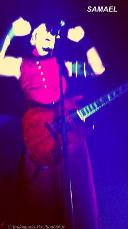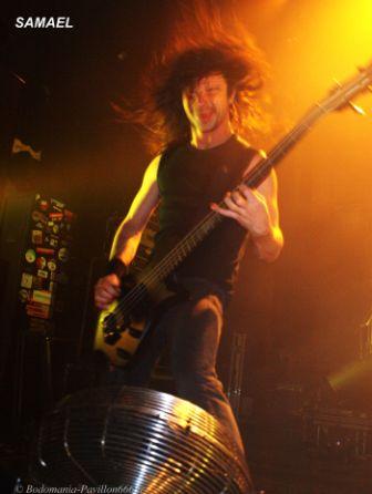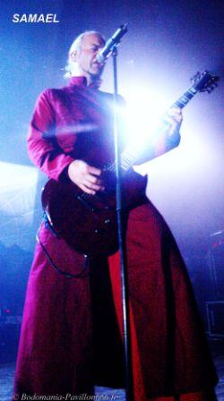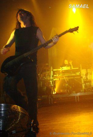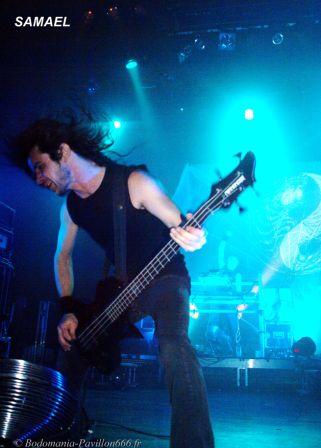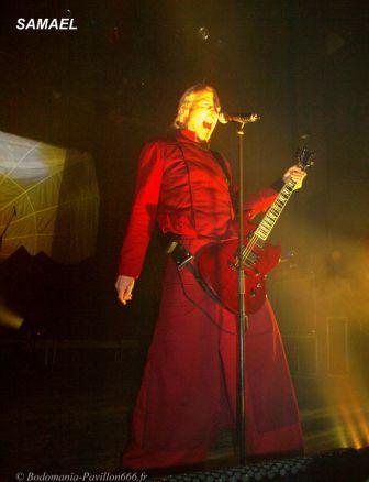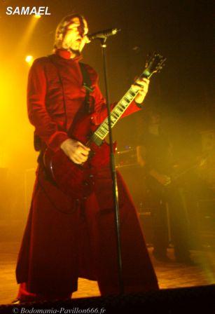 Si ROTTING CHRIST avait chauffé le public, l'univers froid de SAMAEL mérite un petit temps d'adaptation. Passée presque inaperçue, ce n'est pas l'annonce de leur ep paru il y a quelques jours qui brisera la glace, mais piochant ainsi d'une période à une autre, les amateurs du groupe ne regretterons pas leur venue en découvrant "Antigod" et "Soul Invictus" en avant-première. Délivrant des morceaux anciens, avec "Rebellion", jusqu’à ceux de leur dernier album sorti l'an dernier "Above", une décennie entière s’écoule avec une certaine unité, en dépit de leurs styles si différents. Les créateurs s'affèrent. Autant Xy qui bondit et malmène son clavier (et qui aurait mérité un meilleur son pour donner plus de puissance à ses percussions), autant le charismatique Vorph, qui assure ses parties vocales et guitaristique sans grande difficulté, en n'omettant pas de communiquer avec le public. Comme à son habitude, Masmiseim ne cesse de sautiller derrière sa basse, le sourire aux lèvres, déployant une énergie très communicative. Makro se fait plus discret mais ses interventions sont aussi efficaces. Bénéficiant d'un assez bon son et d'un jeu de lumière très "solaire", le climat se réchauffe peu à peu et le visuel et la musique viennent se confondre pour nous donner un beau spectacle. Le chanteur fera appel aux prouesses vocales du public sur (qui n'est décidemment pas à son maximum à ce stade là) afin partager le dernier titre qui n'est autre que "My Saviour". Une sortie assez chaleureuse s'en suit finalement pour SAMAEL, qui a donné son maximum ce soir.
