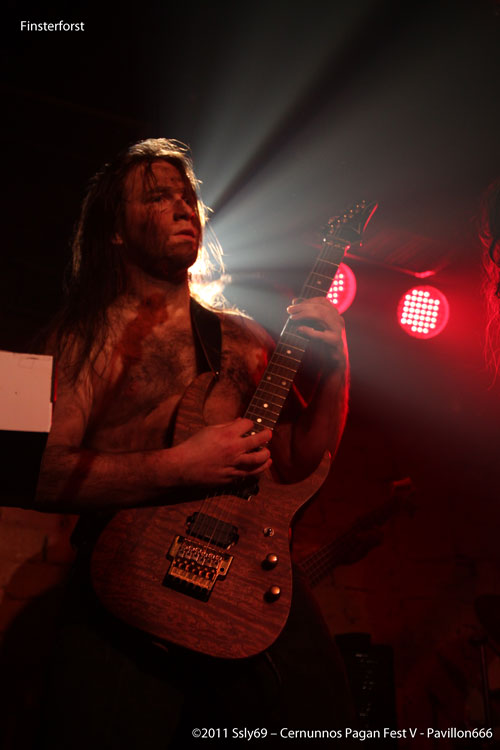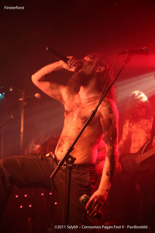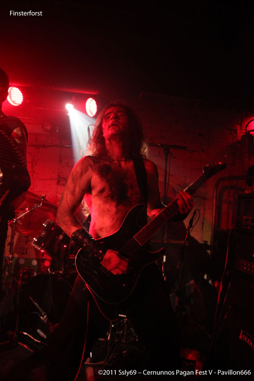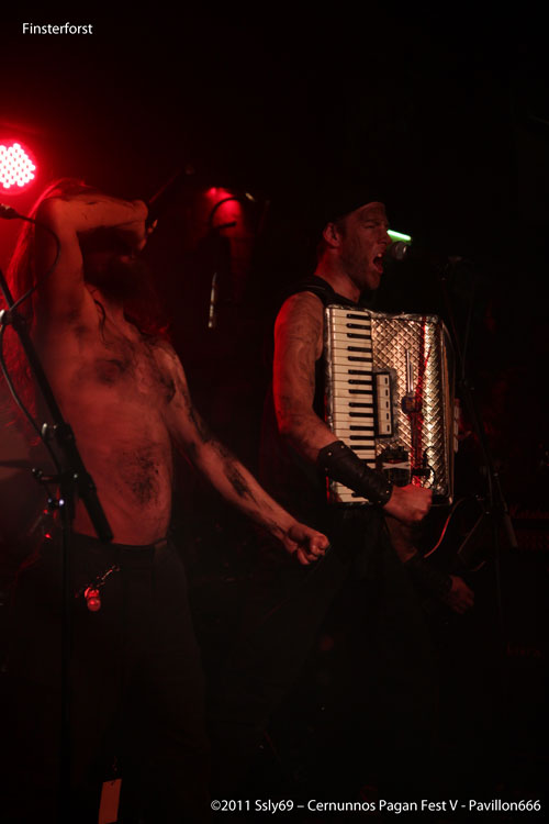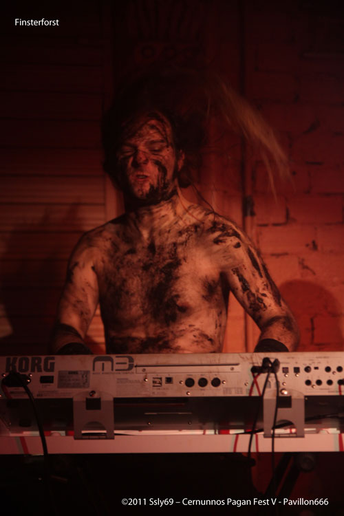 Le temps de redescendre que FINSTERFROST à déjà investi la seconde scène, ceux qui ne connaissent pas le groupe s'étonnent de voir un accordéon tenu par l'un des protagonistes, qui pour l'occasion s'étaient grimés tel des mineurs couverts de suie. Le chanteur et le claviériste quant à eux ont décidé de nous accueillir bière à la main, histoire de se rafraichir pendant les passages calmes. Le fait d'avoir un accordéon sur scène ne donne pas un jeu à la Yvette Horner, bien au contraire. Comme quoi il fallait trouver le bon groupe pour avoir un usage différent de cet instrument généralement confiné au grenier avec les souvenirs de papy.