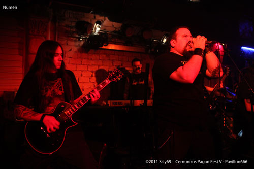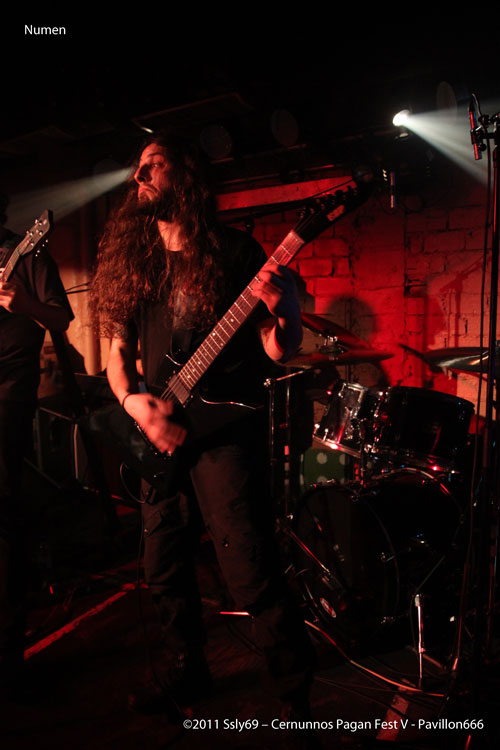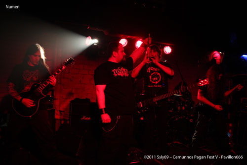 Retour à la petite scène avec NUMEN, formation espagnole de Black Metal, le groupe est motivé, le public aussi, quelle joie... La voix puissante du chanteur sert de cri de ralliement, et ne se fait pas prier. Alors que beaucoup se régalent de ce son outrageusement sombre, un défaut se fait sentir, l'une des guitares se fait aphone, un ampli aurait cramé semble-t'il, ceci n'empêche pas le groupe de terminer sa partie, malgré la guitare qui sera mise hors jeu trop rapidement pour ne pas revenir.