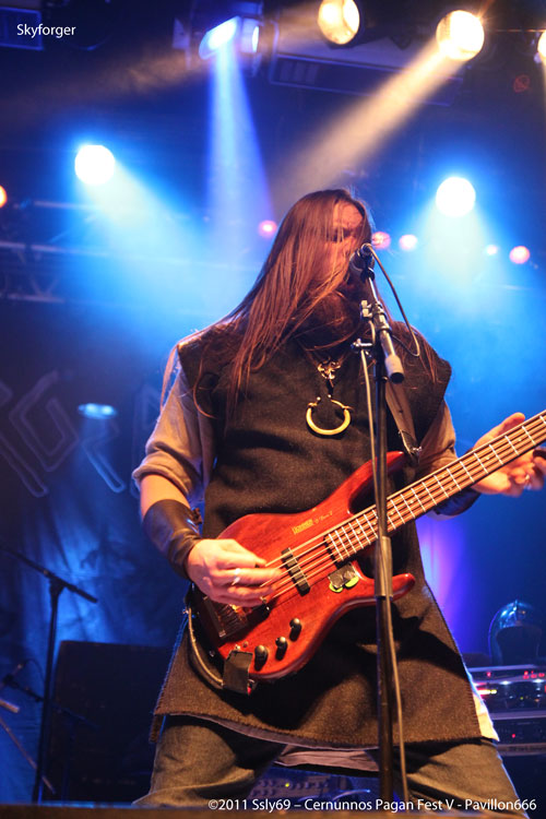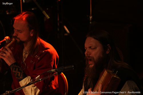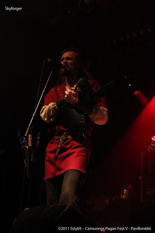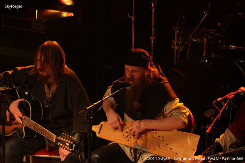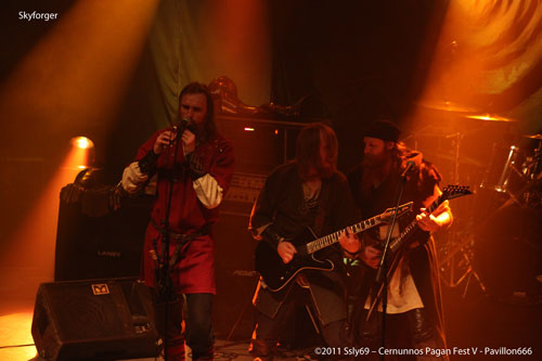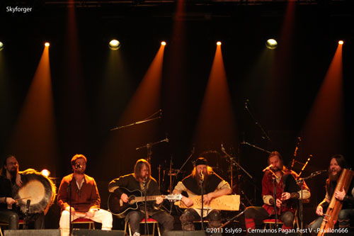 C'est devant une foule que se fait le retour sur la grande scène, et pour cause le prochain groupe annoncé est SKYFORGER. Leur nom sur les t-shirt du public semble futil pour prouver que le groupe a de vrais fans dans la salle tant les gens semblent n'attendre que leur apparition. L'ouverture de rideaux nous offre en fait une agréable surprise, pour une bonne raison: tous les membres du groupe sont assis, en arc de cercle. La seule guitare présente est une folk, pas de batterie ou encore de basse, mais bel et bien une pléïade d'instruments traditionnels qui sont présents sur scène, c'est donc parti pour un set entièrement acoustique, encore une fois pour le plus grand bonheur des spectateurs.