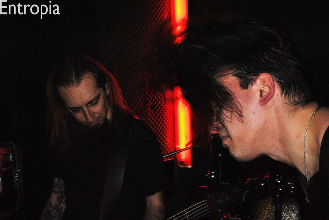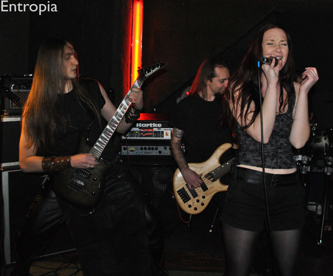 Que font les lyonnais férus d’underground maintenant que leur cher Lyon’s Hall est mort ? Et bien ils vont à Saint Etienne. En effet pas mal de lyonnais répondront présent ce soir pour cette affiche black/death gratuit qui promet du lourd. Au final la salle sera comble à tel point qu’il en devient difficile de se déplacer et que la chaleur monte très vite. C’est le groupe Auvergnat ENTROPIA qui a la charge d’ouvrir la soirée. Après une petite introduction composée de gazouillis de nourrissons le groupe déploie ses armes. Sur un mélange black, death thrash, le tout très mélodique, une voix féminine à la fois lyrique et à la fois criarde vient s’ajouter. Rien de très original me direz vous. Certes, mais ce qui compte ici c’est la qualité des compositions et du show. Le constat final reste mitigé, certains passages sortiront du lot, d’autre se fondront tout simplement dans la masse sans laisser de souvenirs. Notons tout de même le morceau « Beyond The Veil », efficace et entraînant, montrant que le groupe possède de bonnes capacités à exploiter. Il y a de bonnes choses, d’autres moins bonnes, de plus la fatigue se fait sentir sur les deux derniers morceaux ou le batteur aura du mal à suivre le rythme. Il reste encore du travail à effectuer mais il y a quelque chose. Bravo à ENTROPIA donc.
