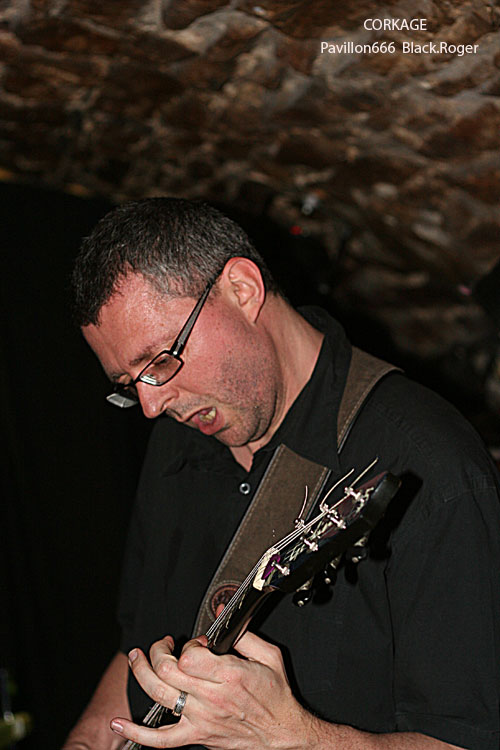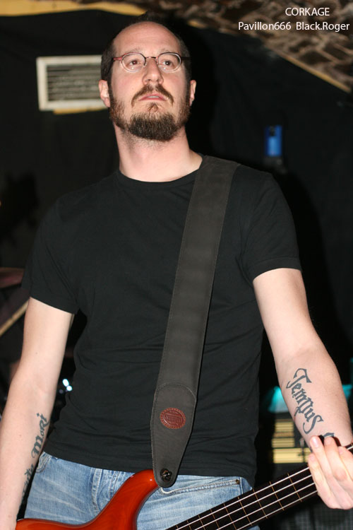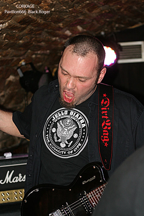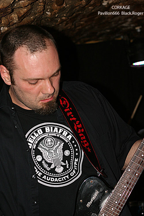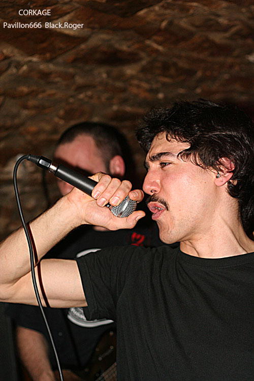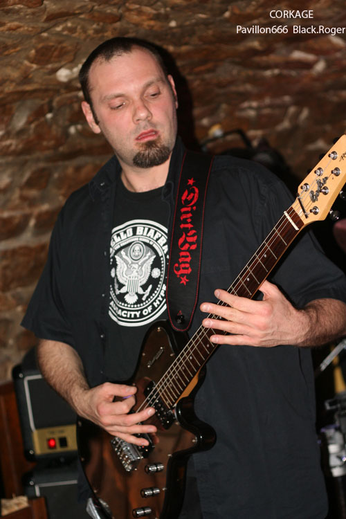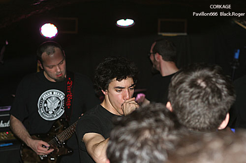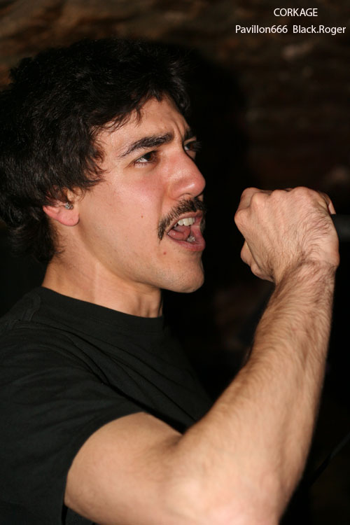 Après la visite du bar à l’étage et les commentaires d’usage pendant l’installation du groupe suivant, on redescend au sous-sol pour se retrouver « underground » devant les Lyonnais de CORKAGE qui font leur « check » avant de nous introduire dans leur métal qu’ils appellent death/grunge, pourquoi pas ! La cave est pleine cette fois-ci jusqu’en haut des escaliers et le set peut commencer. Les cinq musiciens ne sont pas nés de la dernière pluie et ont déjà fait parler d’eux dans les 90’s. Après un certain flottement de quelques années, le groupe remonte au créneau en 2007 avec notamment l’arrivée d’Amine aux vocaux. Depuis, CORKAGE a enregistré sa démo 4 titres « Death To The Deserving » et écumé les salles de concert de la région, la motivation et l’enthousiasme étant à nouveau au rendez-vous. Et cela se ressent bien ce soir avec des compositions variées faites de climats prenants, de voix claires rock « grungy » et d’envolées brutales où le death métal revient en force avec ses « growls ». Le chant du frontman est modulable dans différents registres et c’est peut-être cela qui fait la différence. Les guitares enveloppent le tout de leurs « tricotages » particulier, ajoutez à cela une basse omniprésente et inventive, une batterie electro-choc, et vous aurez ainsi un quintette sachant nous tenir en haleine avec des morceaux naviguant entre rock aventureux et métal plombé. Leur prestation d’une heure environ fut donc bien appréciée par l’assistance, seul bémol le bon son ne fut pas toujours au rendez-vous. Malgré cela ce concert nous a démontré encore une fois la bonne tenue de CORKAGE dans la scène métal de la région, et pourquoi pas plus loin, qui sait ?