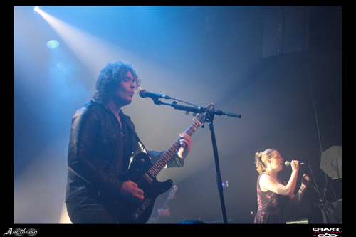 ANATHEMA est là pour défendre son dernier album. Et bien ils ne vont pas s’en priver ce soir. C’est un set un peu particulier que le groupe a mis en place, un set divisé en deux parties. La première est consacrée à l’intégralité de « We are here because we are here » et la seconde à des morceaux forcément plus anciens. Il vaut mieux être familiarisé avec ce nouvel album. ANATHEMA a évolué suite l’enregistrement de ce disque en devenant encore plus posé et plus onirique que jamais. On sent toutefois un Danny légèrement perturbé en début de set sans que l’on ne comprenne vraiment pourquoi. Vincent quant à lui aura une remarque à l’intention de certains photographes jouant des coudes pour prendre leurs clichés au détriment des spectateurs du premier rang. Mis à part ces deux faits, le groupe se met vite à l’aise. Si par le passé ANATHEMA avait quelques difficultés à être juste en live, c’est une chose qui appartient dorénavant au domaine des souvenirs à oublier. Le long processus de ce dernier enregistrement a permis au groupe de devenir impeccable en live. Le dernier album joué en live sonne exactement comme sur le disque. Lee DOUGLAS au chant féminin est elle aussi présente sur cette tournée pour notre plus grand plaisir. Il était tout de même assez rare de la voir dans ce type de concert. Ce « We are here because we are here » est surement un virage musical pour ANATHEMA et on peut le deviner lors de cette prestation. Il y a eu un avant et il y aura un après, c’est certain. Après que la dernière note de « Hindsight » ait fini de résonner, le groupe enchaîne sur des titres plus classiques en commençant par « Deep ». L’énergie est différente, un peu plus électrique. Dans ces années là, le groupe allait plus directement à l’essentiel avec moins de sonorités diverses. On sent cette différence dans l’écriture. On sent aussi dans cette simplicité plus évidente tout ce qui fait l’intérêt de ce groupe. L’énergie, la sincérité et l’intégrité musicales sont la force du combo depuis des années. Rien détonnant à ce que cela soit toujours aussi percutant. Parmi les titres choisis pour cette seconde partie, on retrouve de véritables pépites, « Release », « One Last Goodbye », « Judgement », « Flying ». Juste avant le rappel, ANATHEMA interprètera un autre titre excellent, « Closer ». Mais avant cela, Danny CAVANAGH aura exécuté deux interprétations acoustiques remarquables. La première n’est plus vraiment une surprise puisqu’il s’agit de « Are You There ? » disponible dans la même version sur l’album « Hindsight » ou même en version live en compagnie d’Anneke VAN GIERSBERGEN sur l’album « In Between ». La seconde par contre est une version à deux voix et en acoustique de « Parisienne Moonlight » qui elle est nettement plus rare en concert. La présence ce Lee sur cette tournée n’a vraiment que du bon. Le groupe partira après un rappel de rigueur sur deux titres. Le premier « Shrould Of False » est malheureusement raté. Enfin, raté est un bien grand mot. Les SMITH, aux claviers, s’est quelque peu mélangé les pinceaux et s’en est rendu compte un peu tard. Du coup, il lâche un gros mot que tout le monde entendra et qui rend complètement hilare le reste du groupe. Du coup, l’effet mélancolique en prend un bon coup mais ANATHEMA s’est montré plus que digne de cette boulette en jouant d’humour sur cette erreur. Pour se quitter, quoi de mieux qu’un autre titre incontournable tel que « Fragile Dreams » ?