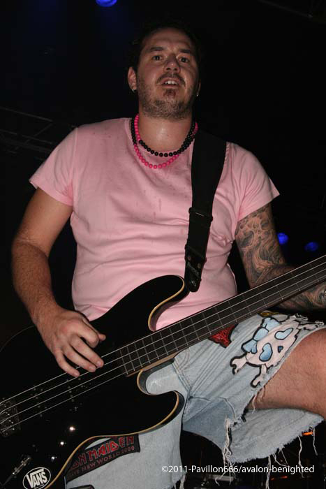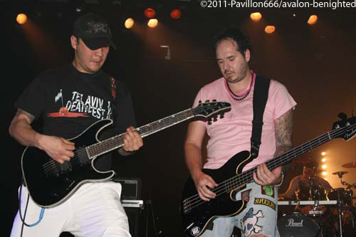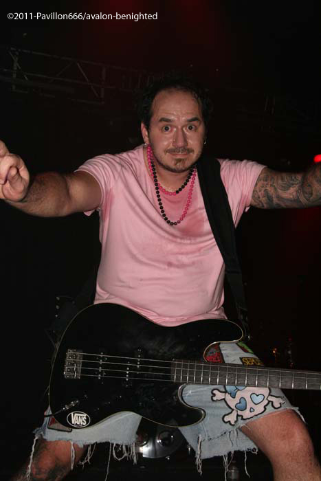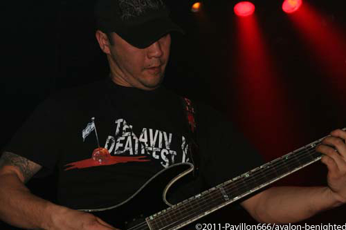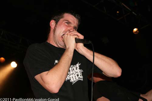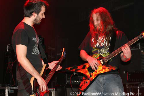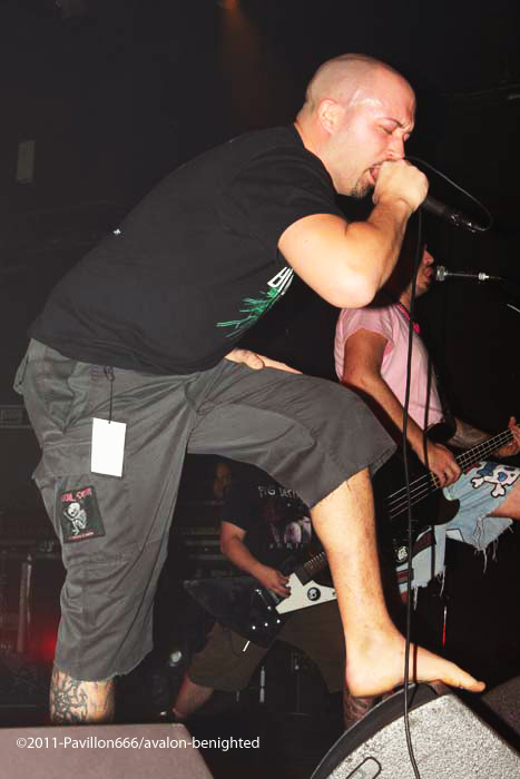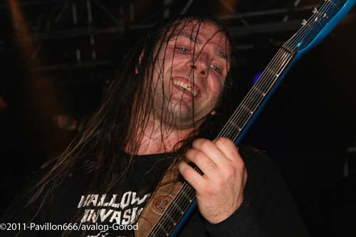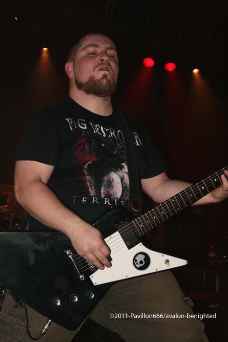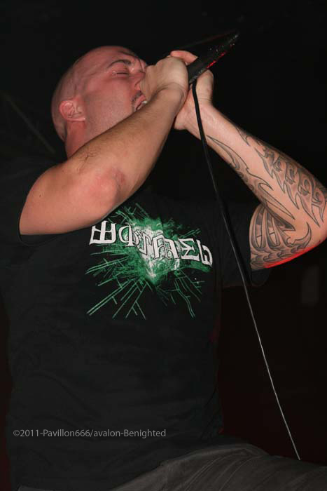 Après ce petit moment de flottement, voilà venu les grands, les indispensables BENIGHTED. Petit changement avec un Liem qui tient la guitare alors que sur un autre concert il tenait la basse. Avec grand étonnement, on le voit prostré dans son coin, concentré, ne bougeant plus du tout, quel changement radical alors qu’avec une basse à la main, il était nettement plus volubile…Quoi qu’il en soit, dès les premières notes, Benighted met tout le monde d’accord. Leur gros death brutal aura raison d’un public déchainé et tout acquis à la cause. Le chanteur harangue la foule avec énergie et à la limite de l’asphyxie tant l’intensité est présente. Foule qui fera honneur en montant sur scène, et slammant à tout va, bien entendu. Benighted, ce n’est plus le rouleau compresseur death/grind que l’on se plaisait à décrire. C’est devenu au fil du temps tout simplement une BROYEUSE à neurones. Une machine à laver qui aura essoré tout le monde avec ce metal puisant, compact, violent et sans concessions. Le (nouveau) bassiste fera lui le spectacle avec julien, et parcourra la scène en long et en large avec un petit coté joyeux en prime. Technique à souhait, brutal comme on le rêvait, les Rhones-alpiens auront distillé un set ô combien réussi et devant leur label Season of mist venu les supporter comme il se doit. Surement LE meilleur groupe death/grind en France à ce jour, donc inutile de vous demander de vite aller les supporter sur scène ou sur album.