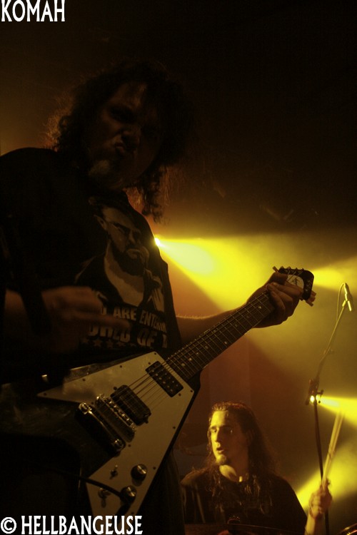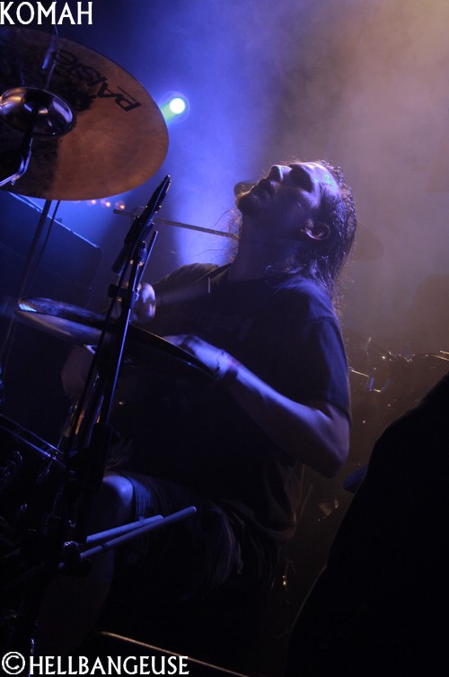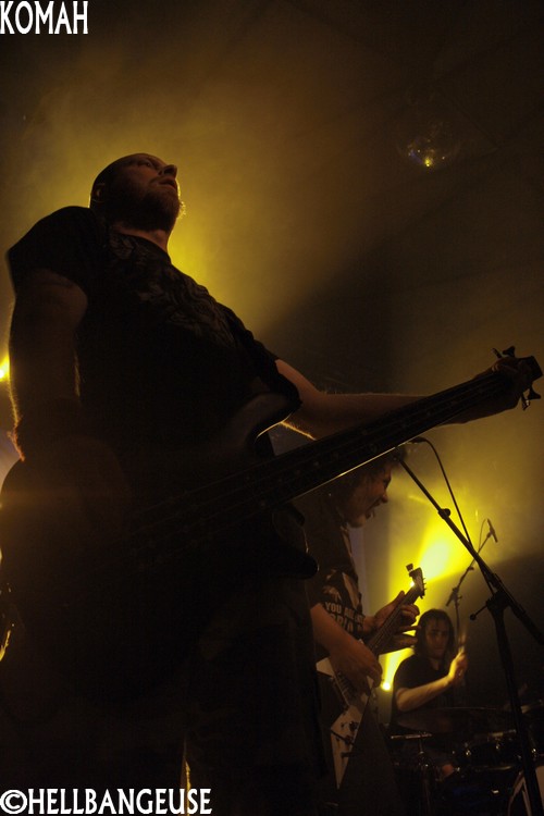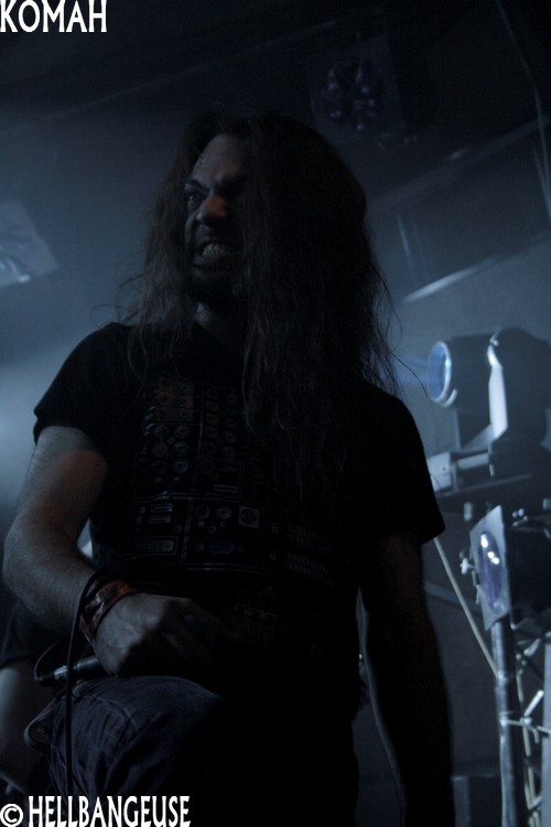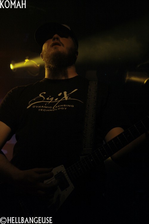 Peu sont ceux qui peuvent se targuer de véritablement connaître le groupe qui défend depuis 2009 son premier album : "Straight Line". Pourtant, la formation a eu l'honneur de jouer au Dour Festival l'an passé mais aussi d'ouvrir sur des tournées intéressantes comme celle de Pro-Pain assez récemment. Le Metal proposé par Komah est de ceux qui absorbent quantité de styles différents (Death, Hardcore, Sludge, Thrash) pour un résultat lourd et gras : une musique efficace qui ne se complique pas la vie. Des parties de guitares un peu plus complexes et enlevées viennent compléter le tout de temps à autre pour donner un relief aux compositions. Ce style finalement assez simpliste possède néanmoins une énergie live qui se transmet aisément et ce n'est pas le public présent ce soir qui s'en plaindra. Les têtes s'agitent avec entrain sur les parties Hardcore qui ne sont d'ailleurs pas loin de passer pour de véritables moshparts en puissance. Toutefois, bien que le son soit globalement honorable, la voix du chanteur ne bénéficie pas de la même intensité se révélant de fait peu audible et maîtrisée. Un sacré point négatif pour un groupe qui prend un plaisir évident à se produire sur scène. Espérons que Komah saura corriger ce défaut problématique puisqu'il serait dommage de faire retomber le souffle qui semble les porter depuis déjà quelques temps chez nos camarades belges.