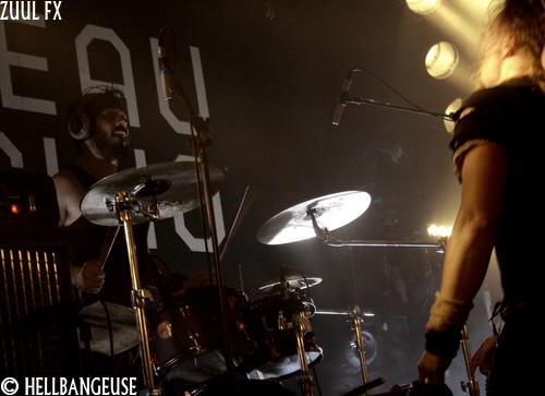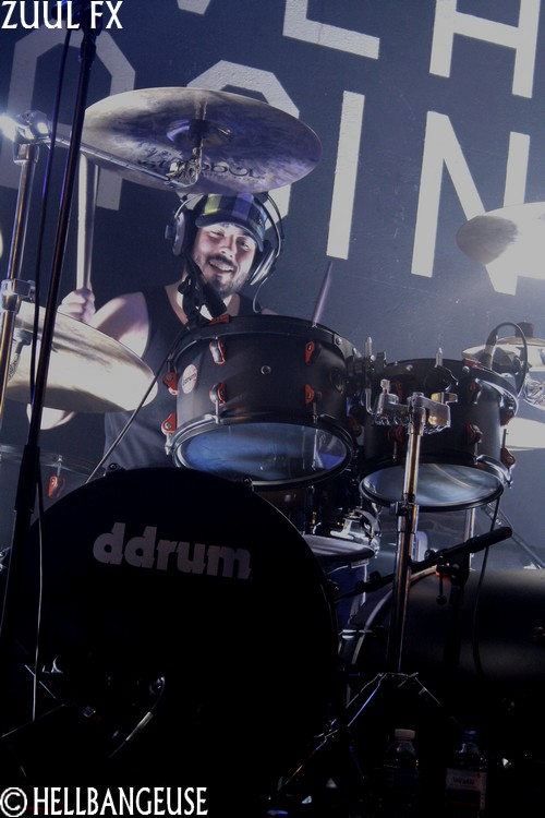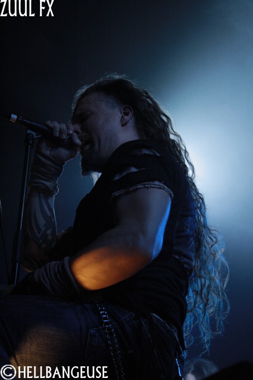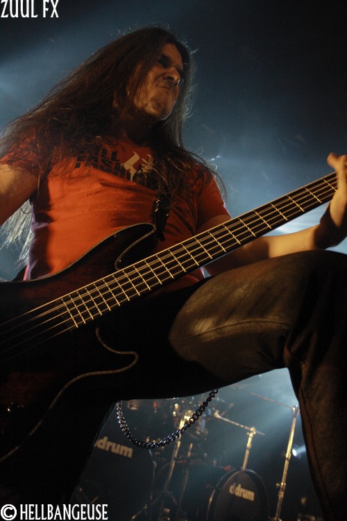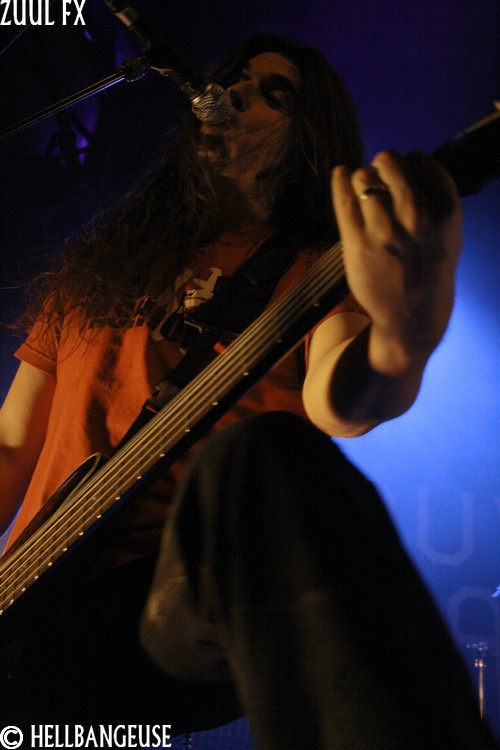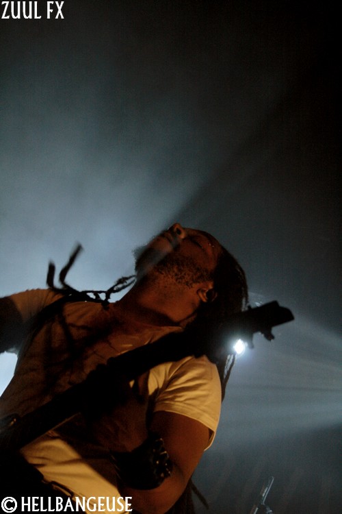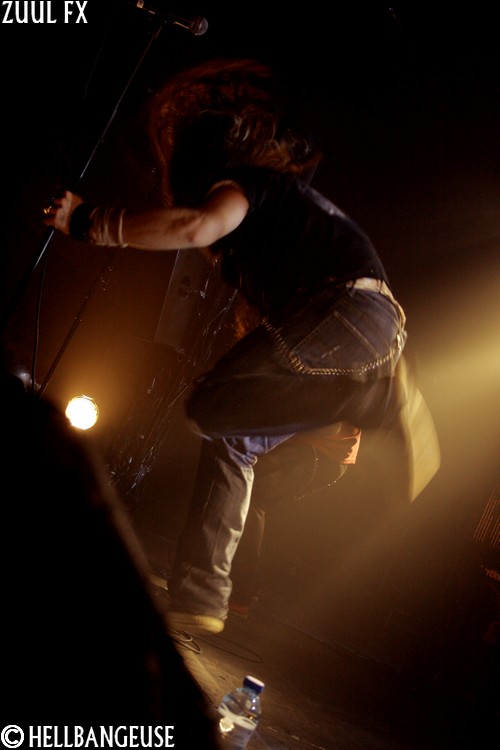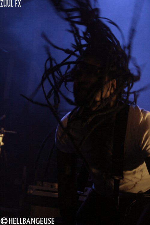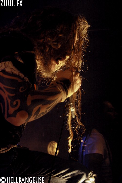 Après quelques rapides balances, les maîtres de la soirée prennent possession d'une salle qui n'attend plus qu'eux. La foule s'est quelque peu densifié et semble prête à en découdre dès que les premières tonalités de l'intro retentissent. Et quand Zuul Fx lance les hostilités avec le tout frais "The Maze", on comprend qu'on n'est pas là pour se reposer. L'énergie véhiculée par ce nouveau morceau est affolante et la fougue avec laquelle les musiciens font crier leurs instruments est plus que communicative. Visiblement, les Parisiens ne se sont pas reposés sur leurs lauriers pour nous concocter ce nouvel album et l'arrivée de Clément Rouxel (T.A.N.K) à la batterie n'y est pas pour rien. Emmenant chaque composition avec une précision millimétrée tout en restant groovy, la musique de Zuul Fx en devient d'autant plus efficace que redoutable. Visiblement enjoué par son retour sur la scène metal française, le groupe nous annonce par la même occasion qu'il ouvrira pour Megadeth et Slayer à la fin du mois. Mais Steeve, qui nous assure souffrir d'une extinction de voix bien qu'on ait du mal à le croire n'en oublie pas pour autant le show. Sa voix semble en effet en pleine forme et parfaitement apte à interpréter le large éventail des compositions au programme ce soir bien que les passages au chant clair ne sonnent pas toujours justes. Les tubesques "Behind the Light", "Hate me Bastard" ou encore "Cabal" se mêlent ainsi avec réussite aux derniers "Man of Silence", "The Torture Never Stops" et "Dancing around Death". Du côté de la fosse, les nouvelles compositions remportent toutes un suffrage unanime comme en témoigne l'agitation qui règne ici bas, entre têtes tournoyantes, cris gutturaux et pogos enjoués. Karim à la guitare et Seb à la basse ne se lassent pas de leurs instruments et se mettent eux aussi en valeur en nous proposant un jeu très lourd (notamment à la basse) et expressif. Et si l'ambiance est bon enfant avec un batteur qui n'hésite pas à faire un petit défilé en caleçon, la qualité de la prestation n'en demeure pas moins très professionnelle. Voilà un show qui ne nous laisse plus qu'à espérer le meilleur pour un Zuul Fx encore plein de ressources et d'humanité.