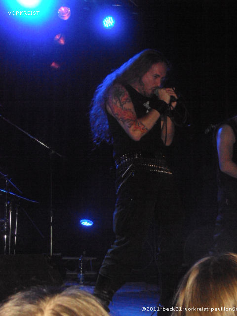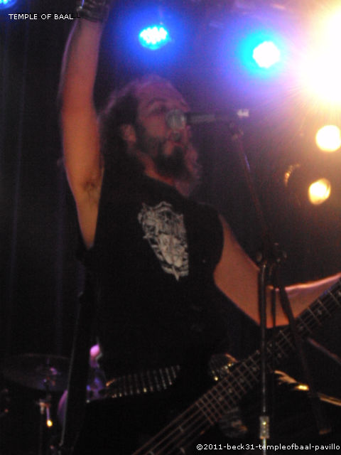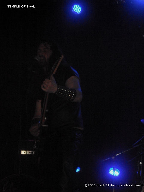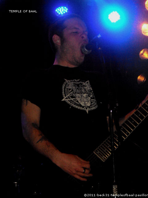Temple Of Baal est venu aussi de la région parisienne. Fort de ses douze années d’activité le combo s’est forgé une belle réputation dans la scène black/death métal française. Après les traditionnels réglages on va donc passé aux choses sérieuses. Malheureusement, dès le début du set on s’aperçoit que la salle s’est nettement vidée, même si les inconditionnels sont toujours là l’heure tardive a fait succombé une certaine partie de la masse préférant aller rejoindre les bras de Morphée. Tant pis pour eux car le quatuor présent nous envoie un black/ death tenace et plein d’entrain. Les morceaux aux refrains très guerriers font pogoter et hurler les derniers survivants de l’apocalypse. Un rythme soutenu, une voix imposante accompagnée de chœurs destructeurs donnant une ampleur particulière pour un show féroce et musclé. De plus la prestance sur scène montre que le groupe a de la bouteille et la maturité nécessaire à nous donner sa musique en live. Un reproche à faire c’est le manque de cohésion avec le public. Les seuls mots sortis par la bande étant « c’est notre dernier morceau », plutôt dommage car dans mes discussions avec certains pendant le concert c’est le principal défaut qu’il en est ressorti, même si le contenu de TEMPLE OF BALL est des plus complets et des plus attrayants.