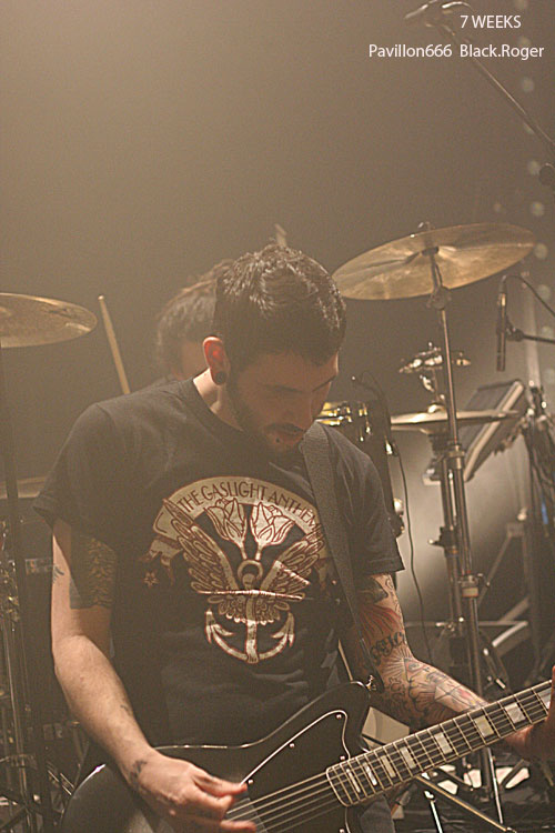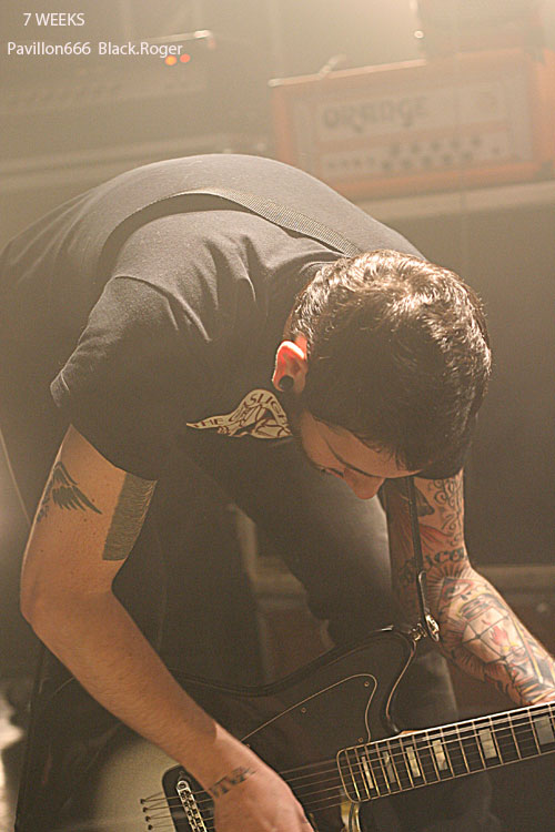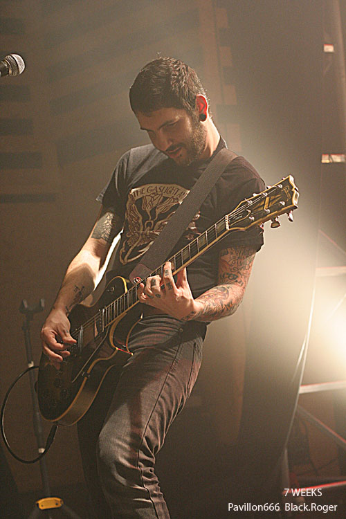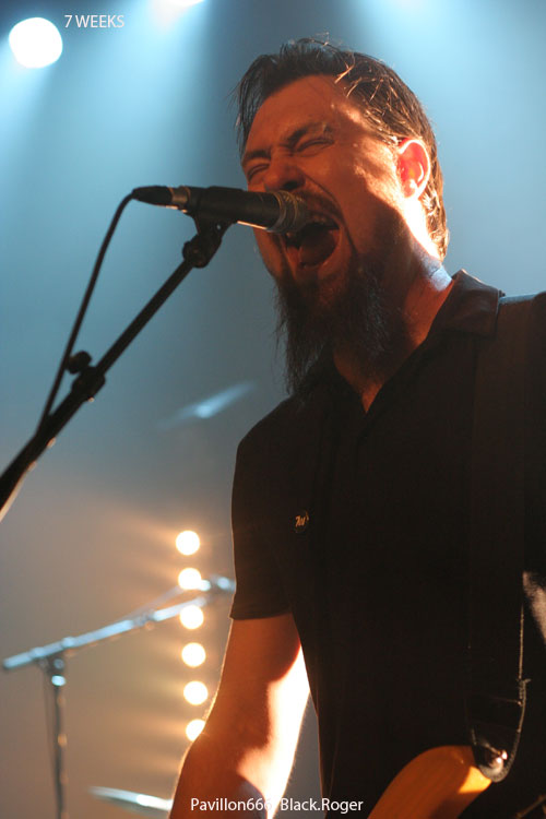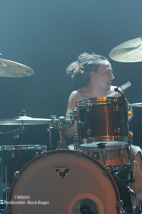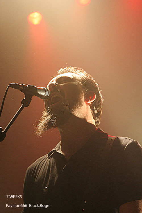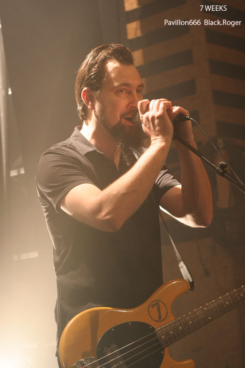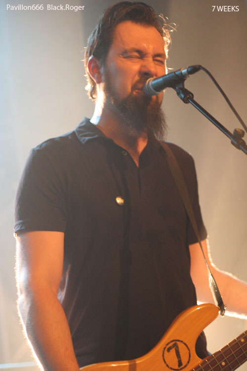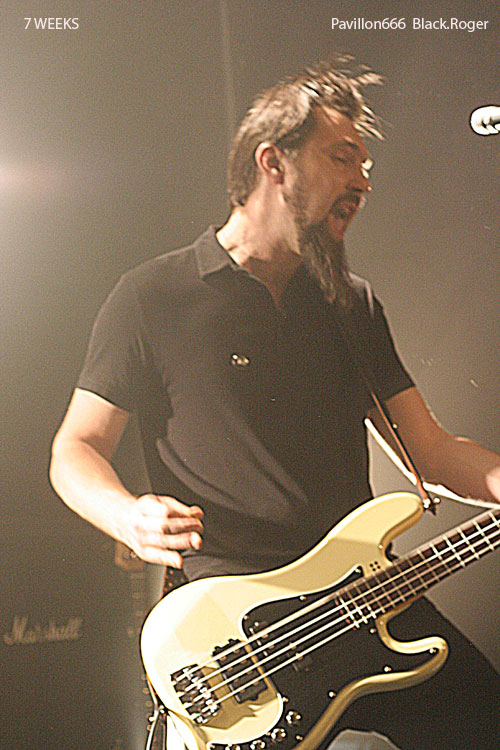Place maintenant à 7 WEEKS de Limoges, quatuor devenu trio apparemment. Guitare basse batterie, tout simplement pour envoyer du gros rock stoner surtout, post-grunge un peu, mais toujours accrocheur et bien en place. Le son est donc bon, les compositions aussi, celles notamment du dernier album « all Channels Off » qui avaient donné lieu à un coup de cœur de la part du webzine pavillon666. Ce soir le trio est implacable dans le rendu scéniques de ses titres binaires et « groovy » qui possèdent en fait une démarche peut-être hybride à certains moments, mais sont redoutablement variés en fait pour peu que l’on adhère au travail de composition du groupe qui est bien recherché. Il faut remarquer le chant du bassiste profond mais aussi éraillé à souhait selon les compositions. Les riffs de la six cordes interpellent avec notamment de petites distorsions faisant la différence. Et puis du côté rythmique c’est lourd et précis, ça ne rigole pas, ça claque. 7 WEEKS semblent avoir satisfait un public en attente de rock-fort, métallisé sur les bords, et émotionnel en même temps. Mission réussie donc pour les musiciens de limoges ce soir.