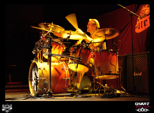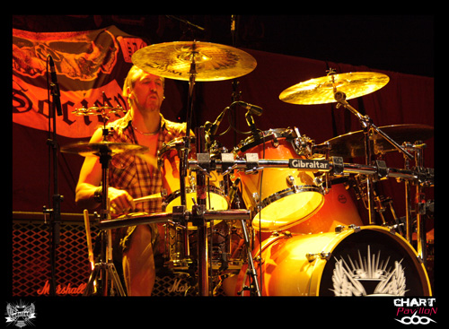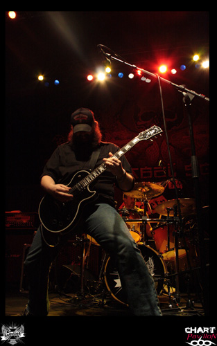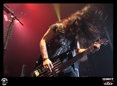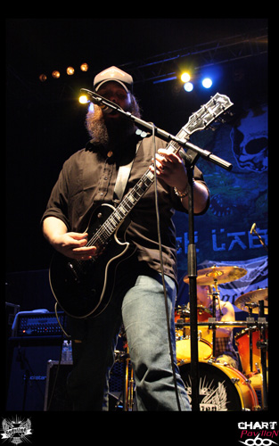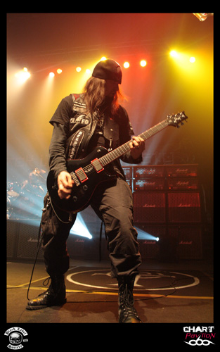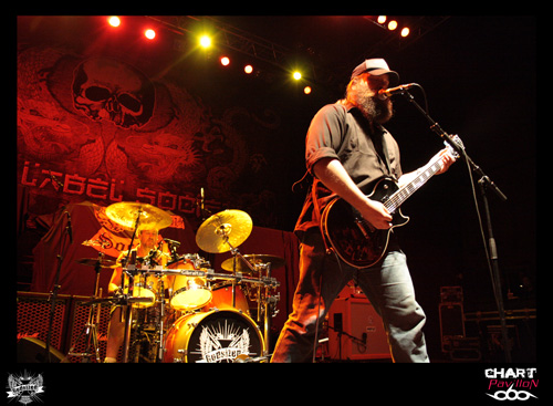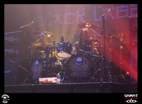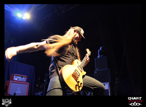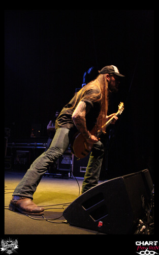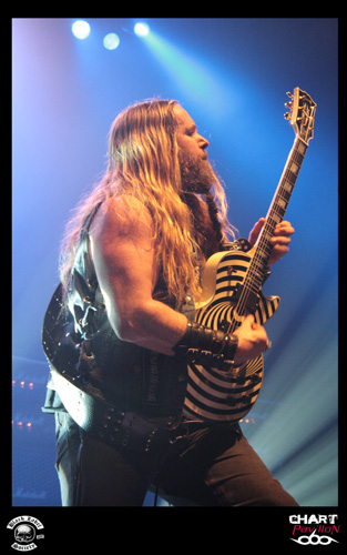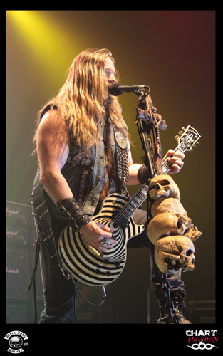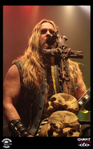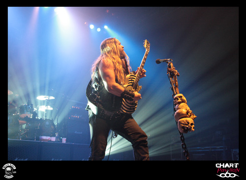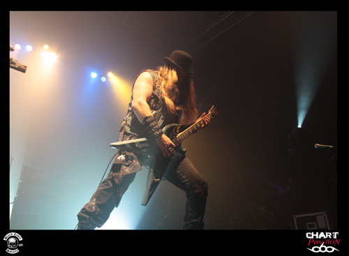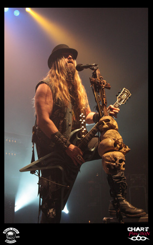 Le rideau est tiré et les roadies se mettent au travail à l’abri des regards indiscrets. Après quelque temps, la salle s’éteint et l’introduction se fait entendre. Pendant ce temps, toujours derrière le rideau Zakk WYLDE se prépare mentalement, un genou à terre, en pleine concentration, prêt à en découdre pour de bon. Le rideau tombe sur les premières notes de « The Begining… At Last » issu de « Sonic Brew ». WYLDE apparaît coiffé d’un petit chapeau melon et de sa guitare Gibson costum au motif Bulleye de rigueur et derrière son pied de micro fabriqué à partir de maillons de chaîne rouillés orné de crânes. Rien que visuellement, on est tout de suite pris dans cet univers. Il faut dire que l’équipe technique, les musiciens et le public portent quasiment tous le logo du groupe. On a forcément un effet visuel remarquable. On pourrait trouver ça un peu prétentieux que de vouloir imposer un certain style vestimentaire mais si ce n’était pas le cas, il manquerait quelque chose à cette ambiance assez hors du commun. Premier titre du dernier album en deuxième position, « Crazy Horse ». En live, on constate avec ravissement que les morceaux anciens ou nouveaux se marient très bien les uns avec les autres. BLACK LABEL SOCIETY enchaîne les titres issus de toutes les périodes. On retrouve dans cette set-list, « What’s In You », « Funeral Bell », “Fire It Up”… Le second titre issu du dernier opus “Order Of The Black” arrive tardivement. Il s’agit de l’excellent « Overlord » suivi dans la foulée par « Parade Of The Dead ». A l’instar d’un certain Axl Rose, Zakk WYLDE chante mais joue aussi du piano. On lui installe un synthétiseur et c’est parti pour un petit solo. Visiblement, une fan a choisi ce moment précis pour exprimer sa dévotion à son idole en enlevant le haut. Le frontman la remarque et s’en amuse. L’ambiance redevient des plus sérieuses avec le morceau suivant « In This River », forcément dédié à Dimebag DARRELL, drapeaux à son effigie dépliés sur les murs d’ampli. Six ans déjà que le guitariste de PANTERA a injustement disparu… C’est peut-être pour cette raison que le seul qui essaiera de monter sur scène ce soir se fera éjecter de la salle sans vergogne par le service de sécurité et les roadies. Après un « Fire It Up » qui remet une ambiance plus légère dans la Coopérative de Mai, Zakk WYLDE se lance dans un solo d’une rapidité effarante. On sait que son boulot, c’est de jouer de la guitare et sur ce coup, on en prend une bonne grosse dose. Le concert se poursuit avec d’autres titres tous aussi efficaces les uns que les autres « Godspeed Hell Bound », « The Blessed Hellride » joué en électrique avec les deux guitaristes équipés de guitares à double manche, 12 et 6 cordes, « Suicide Messiah », « Concrete Jungle ». Le concert se termine sur l’efficacité de « Stillborn » sans aucun rappel. En plus d’être des techniciens hors pair, tous ces musiciens savent occuper l’espace. John DeSERVIO à la basse et Nick CATANESE à la guitare se déplacent, interpellent le public et se donnent à 200%. Ils ne sont pas là pour être de simple faire valoir du frontman. Si Zakk WYLDE est au centre, il peut compter sur un groupe soudé autours de lui.