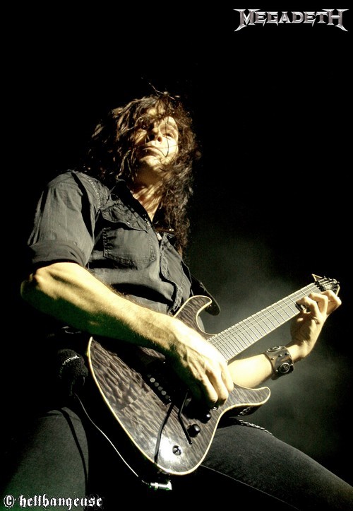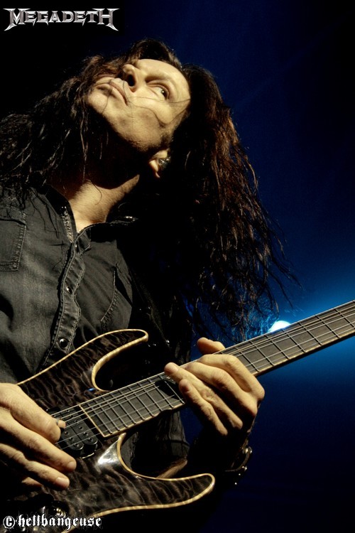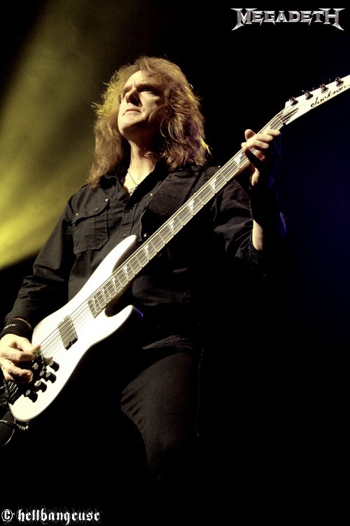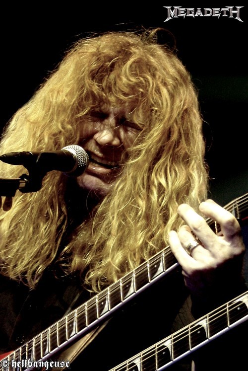 Après une longue attente, MEGADETH déboule sur scène, un Zénith beuglant face à lui. Le groupe, très malin, choisit d’ailleurs d’ouvrir le set avec le relativement calme « Trust », histoire de ne pas assommer immédiatement son public et de mettre bien en place l’ambiance. Mais cette délicate attention se révèle vite vaine puisque la fosse tout comme les gradins perdent la tête dès les premières notes. Ce soir, les fans ont répondu présents à l’appel et ne sont pas là pour s’économiser et encore moins pour remarquer que Dave Mustaine rencontre un sérieux problème de voix. Pour faire simple, aucun son ne sort de son micro et bien que Dave s’époumone à chanter aussi fort qu’il le peut, seuls les premiers rangs peuvent espérer l’entendre. La mésaventure n’est pas des plus agréables et il faudra d’ailleurs un bon quart d’heure pour que l’homme arrive à inonder de sa voix la salle entière, bien que peu semblent s’en être formalisés. Ce problème technique oublié, Dave Mustaine se fait un peu plus loquace avec son public, mais pas trop quand même. Comme ses confrères de SLAYER, le groupe préfère donc se concentrer sur l’aspect musical du spectacle et nous a prévu pour cela quelques titres ravageurs, servis par des soli hors norme toujours bien appuyés par la rythmique infernale d’un Shawn Drover à peine visible derrière son immense batterie. Au niveau de la set-list, le désormais mythique « Rust in Peace » tient la vedette (avec « Holly War… », « Hangar 18 » et « Poison Was the Cure ») bien que le dernier «Endgame » lui colle de près aux basques. Mais le titre que tout le monde attend, orgueil national oblige, c’est bien « A Tout Le Monde ». Véritable apothéose dans un Zénith qui reprend en cœur les paroles émouvantes de la chanson, on en sentirait presque l’émotion du groupe derrière ses instruments. L’hystérie retombe ensuite peu à peu au fur et à mesure que la fin du show se profile à l’horizon et c’est après trois beaux rappels (« Symphony of Destruction », « Peace Sells » et « Holy War… ») que MEGADETH prend congé d’un Zénith ravi. Malgré un son très aigu parfois à la limite de l’acceptable et un sérieux problème de voix en début de set, la prestation du groupe aura été rondement menée et diantrement efficace ; nous voilà rassurés.