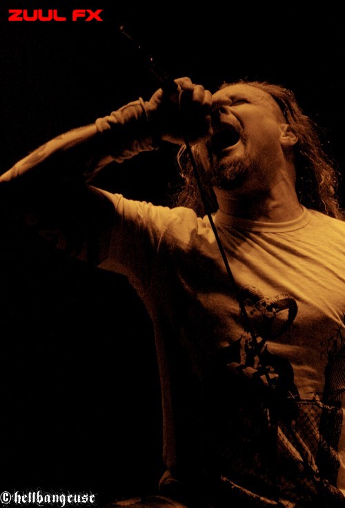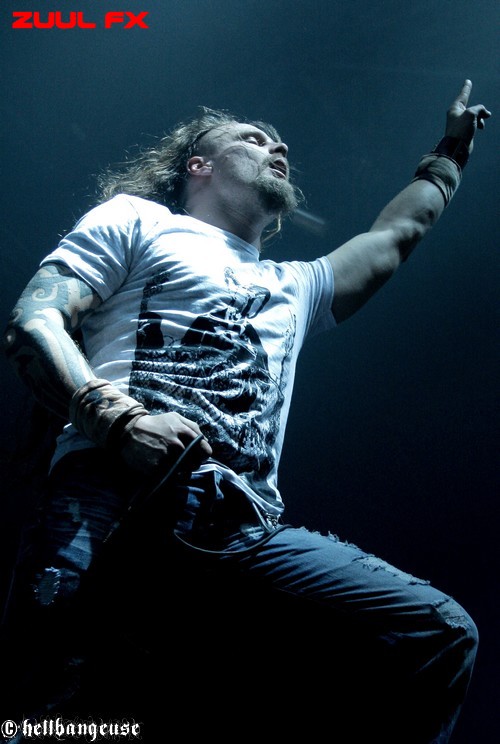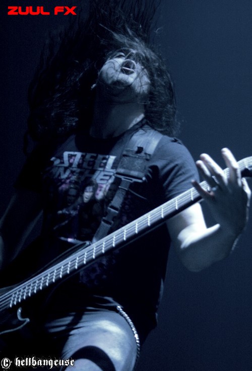 Mais avant d’aller communier, place aux franciliens de ZUUL FX. Avec un troisième album tout juste sorti, « The Torture Never Stops », le groupe semble avoir le vent en poupe et l’opportunité qui leur est offerte ce soir en est sans aucun doute la preuve concrète. Les musiciens ne cachent d’ailleurs pas leur plaisir à jouer et nous offrent une prestation sur-vitaminée, menée avec charisme et dynamisme par un Steeve toujours très en forme. Et même si Karim (guitare) n’a pas pu assurer le show ce soir, Symheris (T.A.N.K) assure avec un certain naturel la relève. La prestation est aussi intense que rapide, enchaînant les uns après les autres les titres les plus convaincants des différents albums. Le public se montre d’ailleurs assez réceptif, ce qui n’est pas toujours évident lors de ces grosses dates où les fans n’ont d’yeux que pour leurs idoles. On déplorera néanmoins un niveau sonore étrangement faible qui aurait gagné en puissance avec quelques décibels de plus.