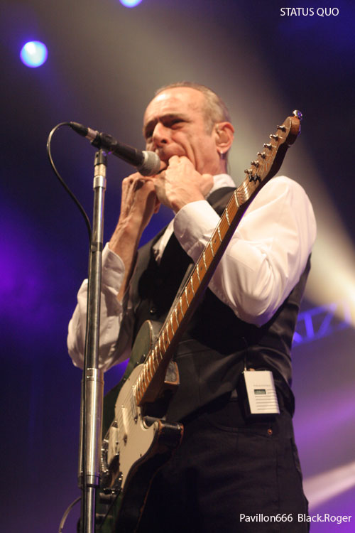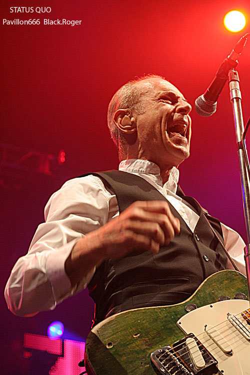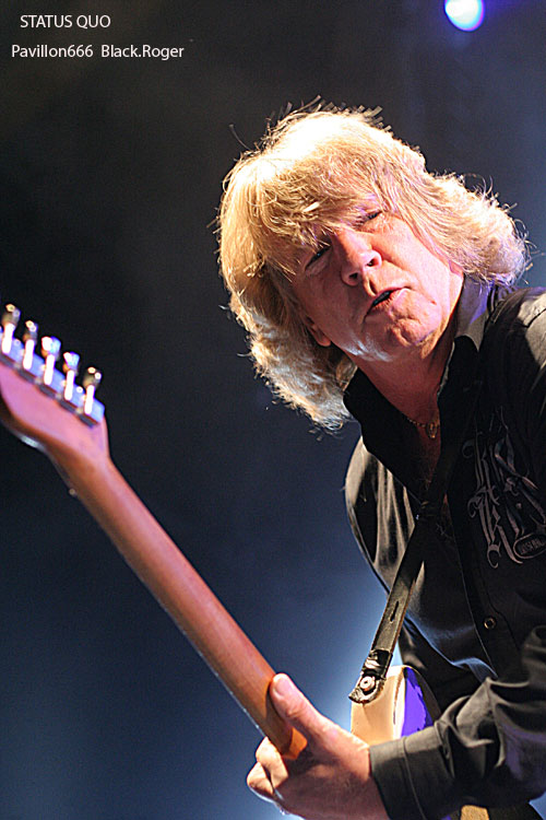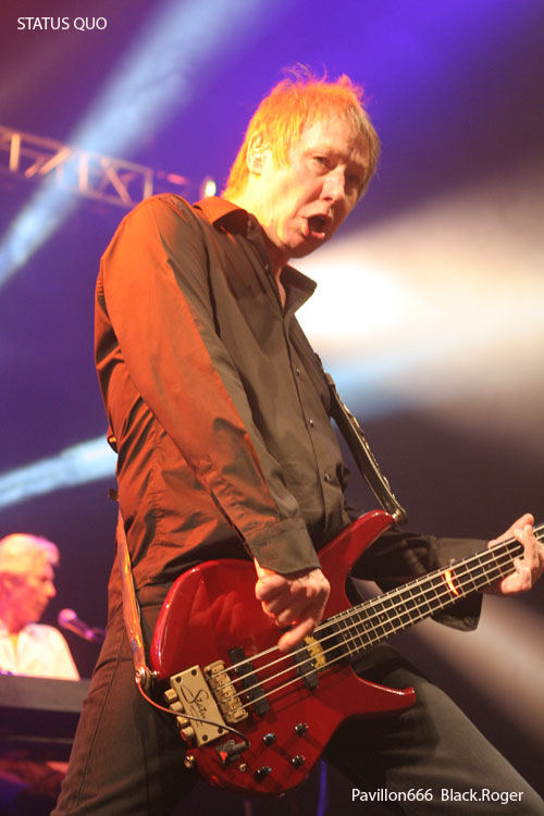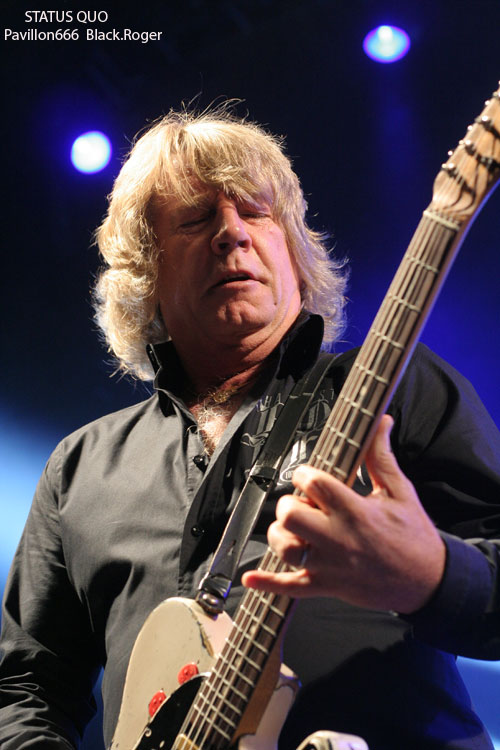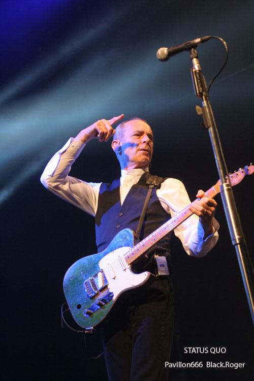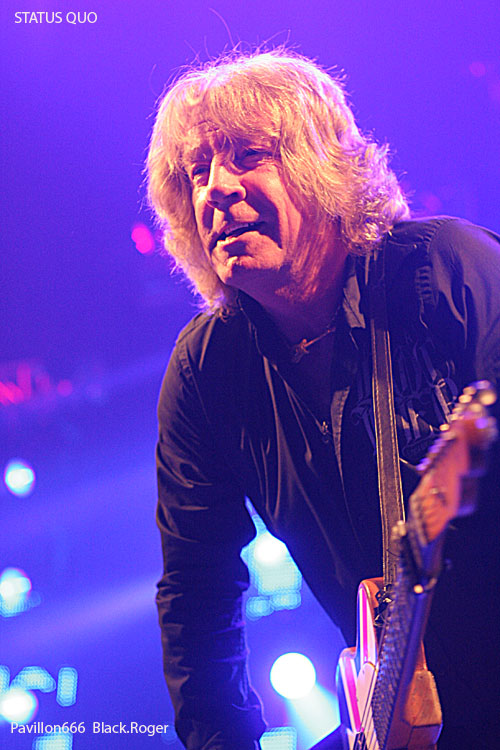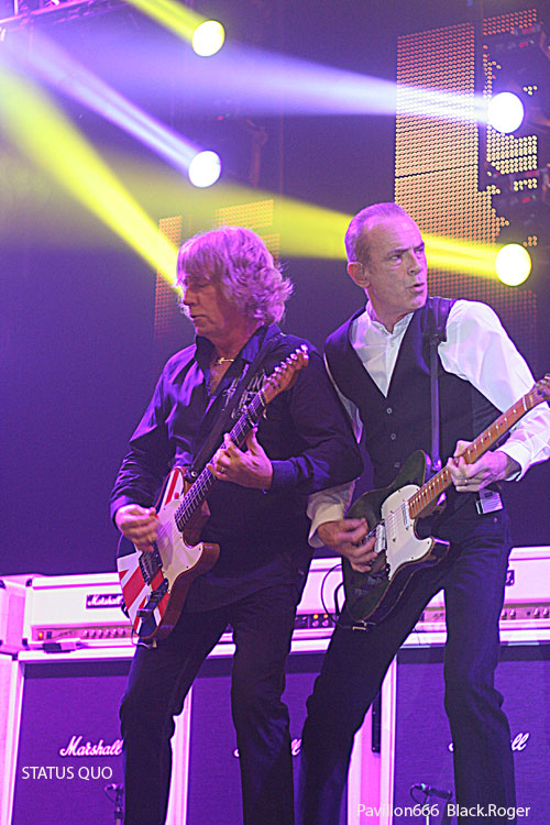Il ne faudra pas longtemps pour installer le matériel de scène des très attendus STATUS QUO. Déjà on s’impatiente quelque peu devant les barrières de sécurité où les membres des fan-clubs ont déployé fièrement leurs bannières. Puis enfin, les lumières s’éteignent puis se rallument aussitôt à l’entré sur scène du « QUO ». C’est alors parti pour presque deux heures de hard-rock/boogie avec en première ligne devant nous Francis Rossi et Rick Parfitt et leurs « télécaster » légendaires. On débute avec évidemment le titre « Caroline » qui donne le ton de la soirée. Mur de « Marshall », lights impressionnants il faut le souligner, le son est bon mais aurait pu être meilleur, c’est le son « Tony Garnier » comme diraient certains. J’avais vu le groupe à Lyon le 11 Février 1979, cela fait déjà 32 ans, comme le temps passe. J’avais vraiment découvert le groupe dans les premières années 70 avec leurs albums « Pile Driver », « hello », « Quo » et « Blue For You », qui ont fait la réputation de STATUS QUO, ce son inimitable, mélange de rock, de hard, de blues, de groove, boogie si vous voulez. Ce soir devant moi, leur musique n’a pas prit une ride (ou si peu). Francis et Rick mettent l’ambiance avec décontraction et humour (le fameux humour Anglais ?). Je ne vais pas vous raconter l’historique de la formation, mais simplement vous dire que ce soir l’ambiance est au rendez-vous, tout le monde s’agite avec ce rock n’roll particulier, tout le monde lève les bras et tape dans ses mains sur le rythme binaire des classiques du groupes. Pour varier les plaisirs, nous avons droit au solo de batterie avec débauche de lights en tous genres, et puis bien-sûr, Rick Parfitt et Francis Rossi y vont aussi de leurs petits solos à la guitare en intro. On ne voit pas le temps passer, le public est toujours en extase avec ces riffs et ces envois puissants et émotionnels qui ne s’interrompent que pour laisser Francis provoquer gentiment une assistance conquise de toute façon. Après environ une heure trente de démonstration inlassable de bon hard-rock, les cinq musiciens de la perfide Albion quittent les lieux. Mais reviennent bien vite pour le rappel avec « Don’t Waste My Time » et un meddley à la Chuck Berry avec « Rock n’roll Music » et « Bye Bye Johnny ». Au revoir « Messieurs les Anglais » ce fut très bon, on n’oubliera pas de revenir vous voir c’est certain, vous nous avez prouvé que le temps n’a pas eu de prise sur votre musique et votre présence.