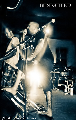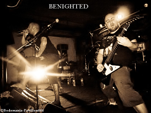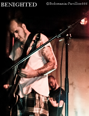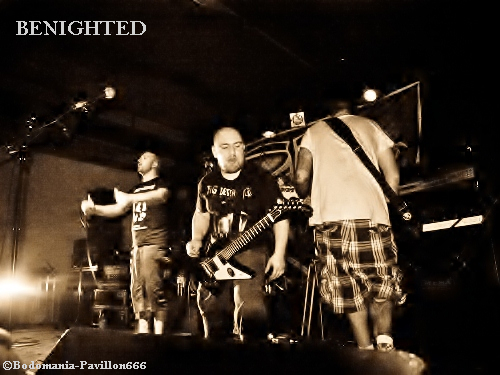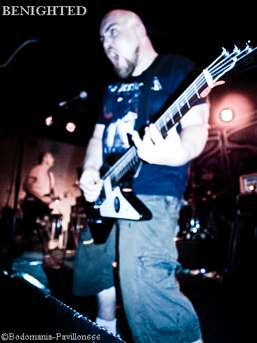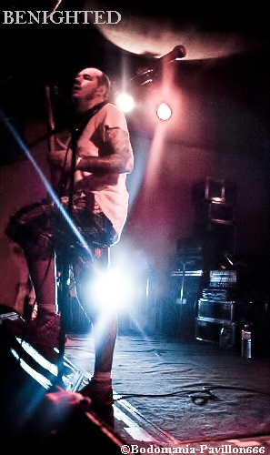 Le Brutal Death/Grincore distillé par BENIGHTED va bientôt résonner, mais une petite présentation s'impose tout d'abord. BENIGHTED, c'est quoi? Des débuts Black/Death suivie d’une orientation plus brutale. C'est également six albums psychotiques, foutrement efficaces. Une signature chez "Season Of Mist" l'an dernier pour la sortie du très familial "Asylum Cave"… Mais c'est surtout une sincérité qui transpire sur scène et une grosse dose d'énergie communicative amenée, en premier lieu, par le vocaliste et chauffeur de salle aux pieds nus, Julien Truchan. Il est minuit, nous allons donc débuter ce mercredi en écoutant les Stéphanois, plutôt sympa quand on y pense... Une introduction clinique retentit... nous y sommes. Renforcé par les changements de tempo schizophrénique habilement imposés par Kévin, les rythmiques malsaines et autres mélodies maladives nous parviennent déjà. Leur dernier album sera donc responsable du tout premier épisode épileptique, car le-titre-à-rallonge-qui-fait-tomber-les-dents s'en suit. "Let The Blood Spill Between My Broken Teeth" ne laissera personne indemne, c'est certain. Mais le frontman en profite pour remercier les rescapés de la soirée, d'être restés malgré l'heure tardive. Ces derniers ne regrettent surement pas leur choix, au vu de l'ambiance qui règne dans la salle... Et en parlant de rescapés, "Collapse" et la jolie berceuse très entêtante nommée "Foetus", seront respectivement les seuls d"Identisick" (2005) et d'"Insane Cephalic Production", sortie en 2003. Une occasion de plus pour maltraiter leur instrument et faire un appel au côté primaire et dérangé présent en chacun de nous. C'est le moment de libérer tout ça! La boucherie continue avec des compositions extraites d’"Icon". "Saw It All", "Forsaken" et même le délicat "Slut" continuent de nous faire pousser les cheveux à l'intérieur. L'atmosphère est moite, le combo donne tout et les déplacements se multiplient, on se retrouve bientôt avec 1,2,3...7 headbangers qui remuent sur scène. Et comme à l'image de cette soirée, la maîtrise est encore là, Candy et Liem nous servent chacun à leur sauce, d'excellentes lignes guitaristiques, le grand Eric nous assène avec tout autant de dynamisme ses mélopées, et Julien alterne avec perfection ses douces parties vocales. Rajoutez à cela, un son enfin bien réglé, et vous obtiendrez un set puissant et sans faille, qui se conclue par le très barbare "Asylum Cave". Mais la soirée ne peut s'achever aussi vite, il n'est pas tout à fait 1h du mat'! Vous reprendrez bien une petite pilule avant de partir? Le meilleur remède est un bon petit wall of death en rappel, agrémenté d’un guitariste qui descend de scène pour aller jouer au fond de la salle, en échangeant quelques mots au merchandising. Voilà ce qu'on appelle un final réussi, en toute décontraction. Et si vous y ajouter "Swallow", alors, on peut s'attendre à récupérer un public sonné mais motivé jusqu'au bout. Le plaisir se lit et on ne peut que remercier les responsables de ce dernier set, pour lesquels l’attente valait vraiment le coup…