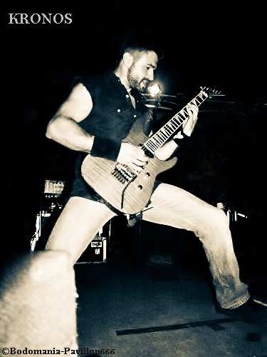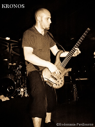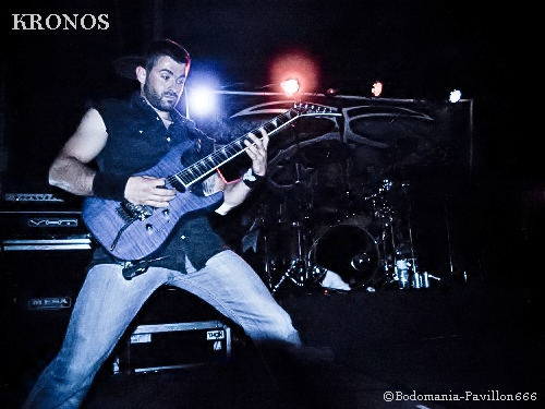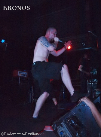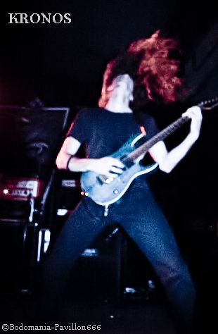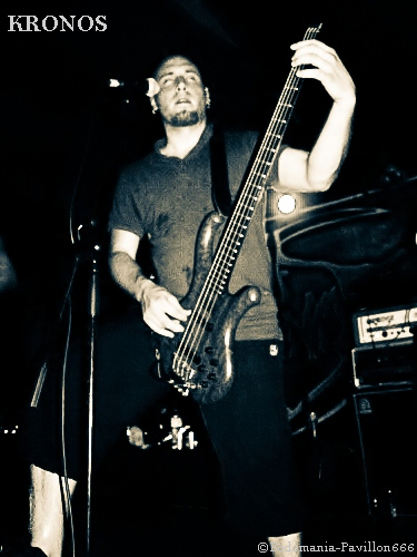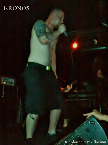 Avec plus de dix ans d'existence au compteur, les membres de KRONOS n'en sont pas non plus à leur coup d'essai, et possèdent déjà une certaine expérience de la scène, mais comme tout comme les autres groupes de la soirée, ils ont également dû faire face à un changement de line-up il y a peu (décidemment!). Remplaçant Kristof au chant, nous retrouverons donc Chris Lewis qui fait ses débuts au sein du combo, ses premières interventions live datant de ce mois-ci... C'est donc le moment parfait pour voir ce que donne la bête! Car mine de rien, l'écossais en impose. Mais commençons plutôt par le commencement… Une vague de brutal death suffocante emplit la salle après l'introduction conquérante de "Mashkhith". Une entrée massive qui sera malheureusement gâchée par le son, celui-ci nous ferait presque exploser les tympans, ce qui rajouterait un côté gore assez sympathique, nous sommes bien d'accord. Mais il reste avant tout très brouillon. Alors, on peine à distinguer la subtilité du jeu de Grams et Richard, pourtant évidente, seule l'agressivité et l'invasion rythmique guidée par Mike arrivent à se frayer un chemin jusqu'à nous. Les titres ont donc moins d'impact, pourtant la diversité est bien au rendez-vous. Puisant dans leur discographie, l'excellent "Eternal Mindtrap" et ses rythmiques thrashy nous ramène à leur autoproduction "Titan's Awakening", tandis que "Colossal Titan Strife" se verra représenter par plusieurs titres, qui portent toujours aussi bien leur noms, tels le morceau éponyme ou "Monumental Carnage", qui participeront largement à la fournaise qui commence à envahir la salle. Mais ce n'est pas la chaleur qui va empêcher les premiers rangs de bouger, et même certains d’entre eux de monter sur scène. En revanche, même si l'accueil est plutôt bon devant, on ne peut pas dire que le reste du public soit agité. Non, tout se passe dans le Taper-du-pied/Headbanging-intériorisé, ou encore dans la transmission de pensée "J'aime beaucoup ce que vous faites, même si je ne le montre pas. Mais je compte bien applaudir à la fin de chaque titre". Bref, d'une manière générale, c'est plutôt calme ce soir, comme si des gradins invisibles avaient investi " Le Complexe". Mais nous sommes mardi, le retard, du bon gros brutal/death dans la face, tout ça.... En revanche, du côté de la scène, les musiciens donnent de leur personne, que ce soit à nouveau derrière les guitares, ou la basse de Tom, qui occupe la scène entre deux backing vocals. Le nouveau venu remplit tout aussi bien son rôle, et même si l'ensemble est un peu statique, le charisme et la maîtrise prennent le dessus. Musicalement parlant, nous aurons encore droit à plusieurs passages de rouleau compresseur avant la fin, "Ouranian Cyclops" et "Bringers of Disorder", entre autres. Ce n'est donc pas leur dernier opus, "The Hellenic Terror", qui va reposer l'assistance... La fin est proche et sanguinolente, "Bloodtower" vient donner le coup de grâce à une heure de démence auditive qui est sans aucun doute à renouveler, dans de meilleures conditions. Les applaudissements qui suivent démontrent en tout cas que le groupe à réussit à dépasser le mur du son, ajoutant au passage, quelques dizaines de degrés Celsius... La déshydratation est imminente!