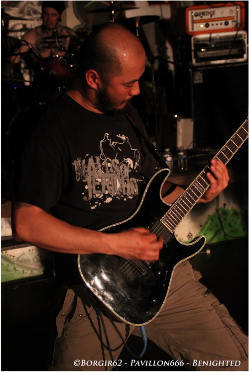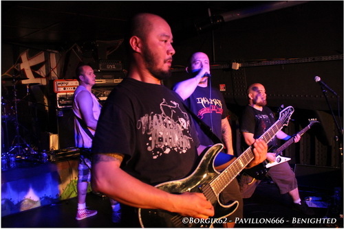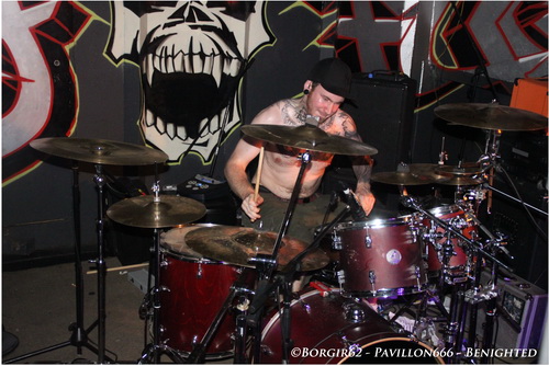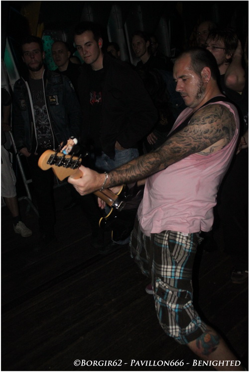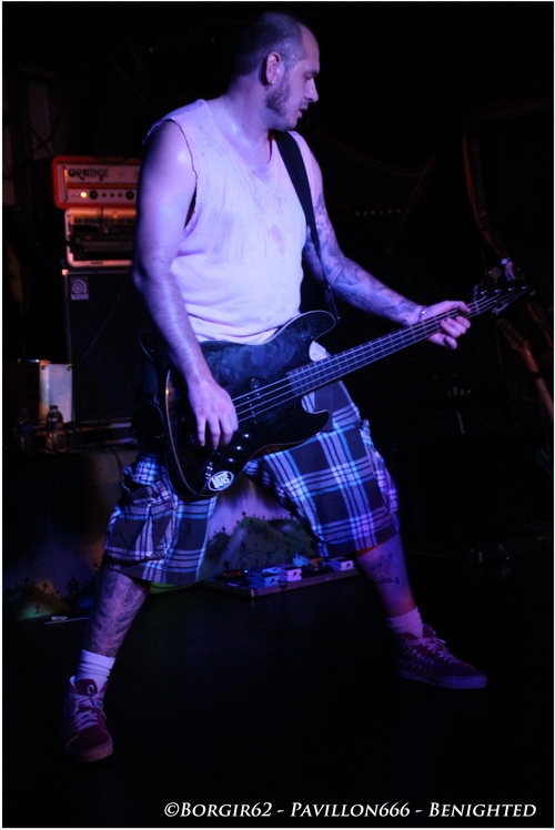 D'enfer il n'y aura pas, admettons-le tout de suite, mais une ambiance un peu plus propice à la fête. Des pogos réguliers mais assez peu fournis, il faut dire que la salle est à moitié remplie alors que BENIGHTED va tout ravager sur son passage. Une intro glauque et "Prey" lance ce qui va être un set exceptionnel en tout point. A la batterie, Kikou nous montre l'étendue de son talent, prouvant que les batteurs français sont vraiment en train d'exploser à la face du monde (faut-il d'ailleurs encore le prouver ?). Le côté joyeux nous viendra du côté de la basse, avec un Candy arborant un marcel rose et surtout, un magnifique tatouage Bob l'Eponge à la jambe gauche. Heureusement son jeu n'est pas fait pour rire et ne cesse d'impressionner notamment aux backing vocals ou lorsqu'il s'agit de venir jouer au milieu du public, voire même de l'autre côté de la salle, devant le bar ! Les Stéphanois faisant la promotion de leur dernière galette "Asylum Cave", c'est donc sans surprise que des titres comme "Let The The Blood Spill Between My Broken Teeth" ou la très joyeuse "Fritzl", sont exécutés à la perfection, morceaux sur lesquels Julien nous prouvera qu'il maîtrise aussi bien le chant hardcore que grind et les cris de porcs, tout en passant par quelques touches blacks et des growls bien poussés. Quelle démonstration aussi bien dans l'interprétation que dans le comportement sur scène. Une sacrée énergie se dégage de cette formation, et Benighted n'est pas là pour faire dans la dentelle. Une partie du public ne s'y trompe pas et entonne quelques chants festifs (pas forcément les plus adaptés, mais qui tiennent la route au carnaval de Dunkerque), au détriment des pogos et des circles pit qui ne font pas long feu, ce à quoi Benighted répondra en lui offrant un "Saw It All" destructeur puis enchaîne avec un joli cadeau: "Forsaken" en duo avec notre ami ecossais, Chris. Une nouvelle fois, on assiste à une merveille de concert et ce titre n'est que le reflet des 3 sets joués ce soir, dévastateurs au possible ! En dépit des chroniques plus qu'exceptionnelles de leur dernier opus, impasse ne sera pas faite sur les précédentes créations, et c'est ainsi que l'on pourra redécouvrir l'album "Identisick" (2006) par l'intermédiaire de "Nemesis" et "Collapse" et on cloturera sur un autre extrait de "Icon", avec "Grind Wit" qui viendra nous achever.