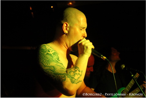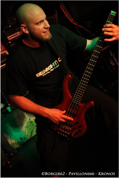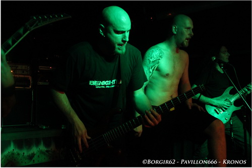 Alors que la plupart termine leur cigarette et leur bière sur le pont, les vosgiens de KRONOS viennent réveiller un public un peu léthargique. Là encore, le groupe a connu un changement de line-up, puisque l'écossais Chris Lewis remplace Kristof derrière le micro. Ce fut d'ailleurs assez drôle d'entendre Chris nous balancer un "We're Kronos from France" et de nous parler constamment en anglais. Néanmoins son intégration au sein du groupe ne semble pas avoir été très dfficile, il suffit de voir la complicité avec Thomas notamment pour s'en rendre compte. Ouvrant sur "Mashkhith", puis "Opplomak", il ne faudra guère de temps pour que je considère le tout comme une énorme claque dans la face. Impressionnants de brutalité, de vitesse, on assiste là à une leçon de brutal death des plus intenses. N'ayant jamais porté attention aux précédents méfaits de Kronos, je suis resté littéralement bouche bée, notamment sur "Monumental Carnage" et "Bringers Of Disorder". Impossible de reprendre son souffle, Kronos enchaîne les morceaux à vive allure, entrecoupé par quelques mots de Chris, en anglais. Espérons que d'ici leur prochain passage en octobre (même endroit), le colosse aura appris quelques mots en français. Mis à part ça, on ne pourra rien leur reprocher ce soir. Bien qu'ayant eu beaucoup de mal à faire les réglages, ce qui fut le cas pour Gorod, et le sera également pour Benighted, l'attente valait la peine tant nous avons bénéficié d'une très bonne qualité de son. Enfin ! On commence à voir des spectateurs motivés, certains se rapprocheront de la scène progressivement et on se met à espérer à une boucherie sur Benighted