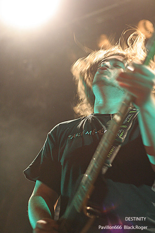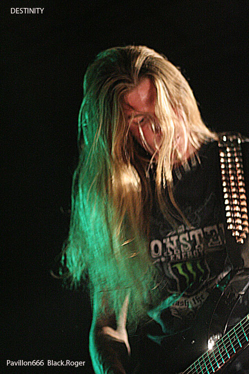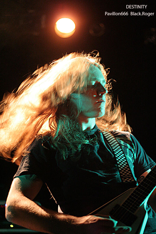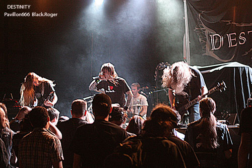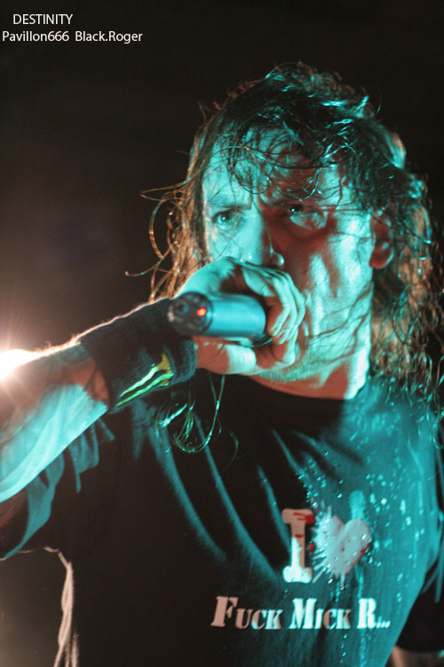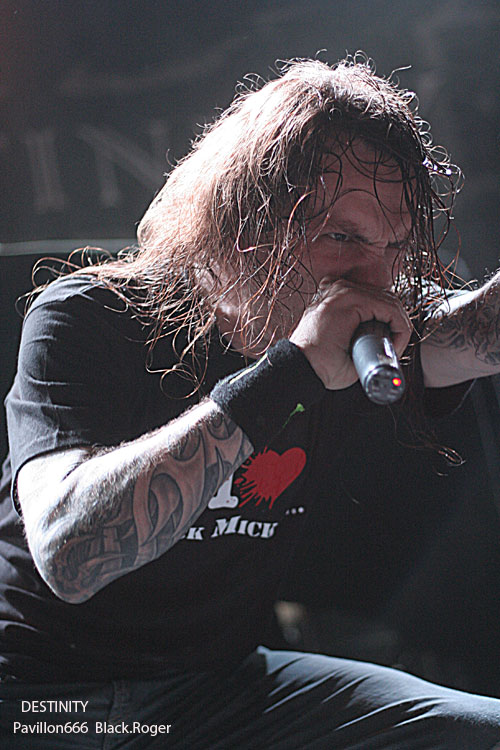 La nouvelle “idée” de la municipalité de Villeurbanne d’imposer une sono “bridée » à 98 décibels, déjà remarquée lors du dernier concert dans cette même salle deux jours auparavant (LE BAL DES ENRAGES), va ce soir s’avérer bien gênante pour les groupes, et le public évidemment. Les concerts de punk, métal et autres,dits « bruyants » pour certains vont en prendre un coup c’est certain au CCO. Il fallait le dire et vous informer, vous amateurs de certaines musiques dites « amplifiées », et au bout du compte « mal-aimées » par des gens « bien-pensants ». Ce coup de gueule passé, revenons-en au concert de ce soir. C’est donc DESTINITY, les thrasheurs que l’on ne présente plus qui vont faire les frais de la nouvelle réglementation. En effet on n’entend pas bien le chanteur/frontman et les guitares semblent lointaines. Et pourtant, le quintette Lyonnais connu hors de l’hexagone déborde d’énergie et de savoir –faire, il fait de son mieux et arrive tout de même à provoquer l’émoi dans les premiers rangs. C’est un show assurément efficace qui se déroule devant nous. DESTINITY reste un bon groupe de scène avec de bonnes compositions, c’est un fait indéniable. Set passionné aux accents volontaires et bien en place qui satisfait tout le monde, le groupe jouant « at home » pour une fois. Très bonne prestation malgré les ennuis cités plus haut.
