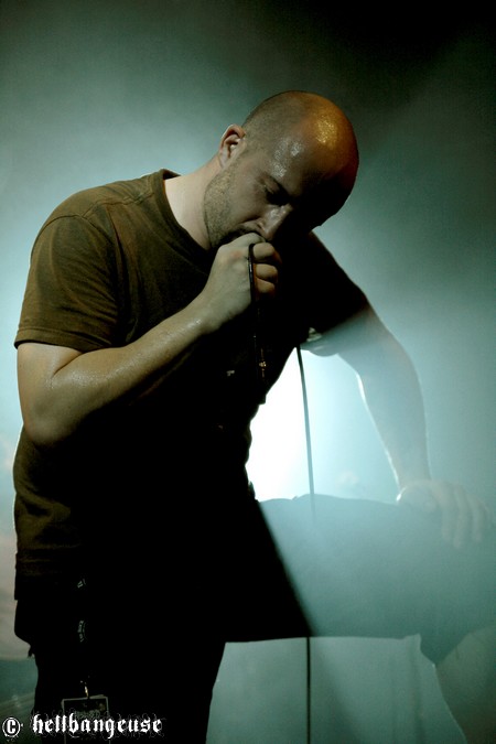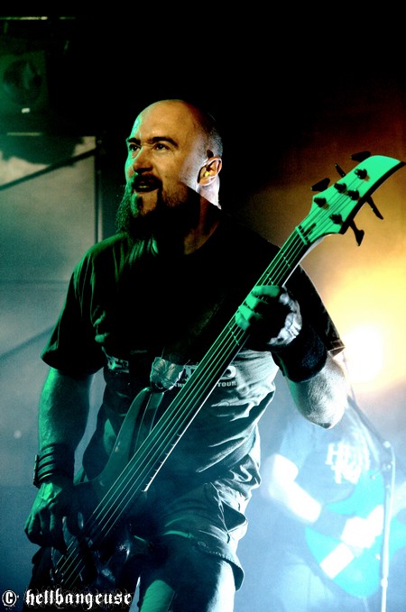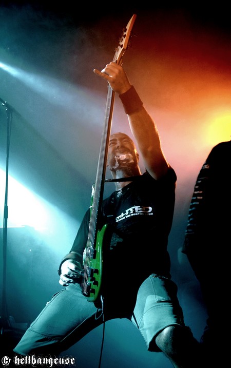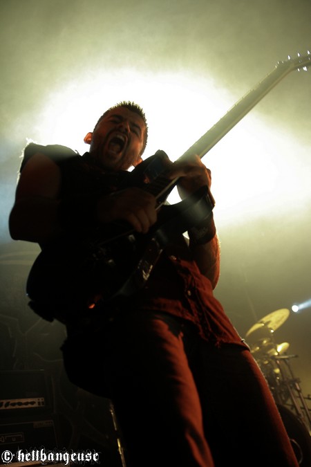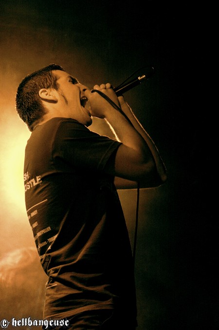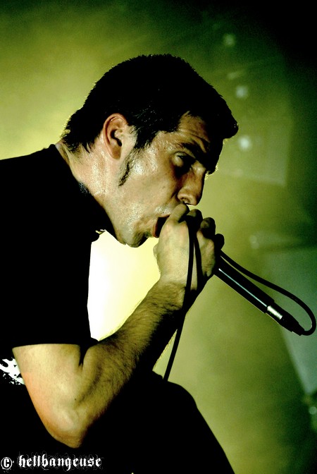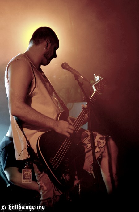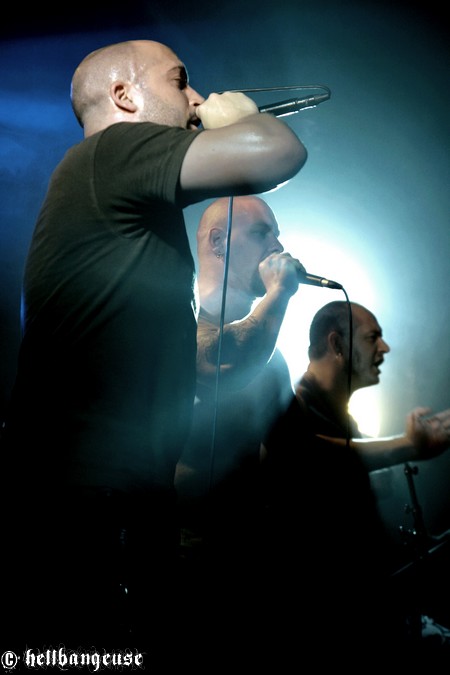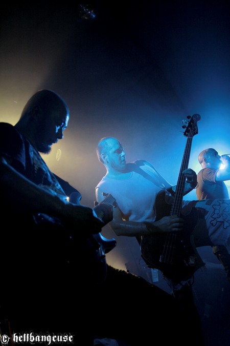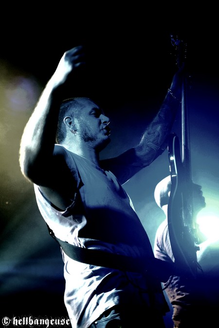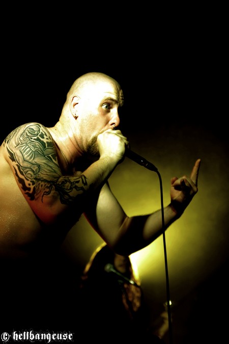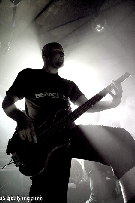 Il est maintenant temps d’accueillir les stéphanois de BENIGHTED qui arrivent tout innocemment sur scène (débardeur rose d’Eric Lombard à l’appui) afin de pouvoir mieux nous corrompre. Le set démarre très fort avec « Prey » extrait du tout nouvel album « Asylum Cave ». Complexité et puissance seront donc les maîtres mots de ce show comme nous le prouve la polyvalence et la maîtrise de Julien Truchant qui alterne à merveille les growls porcins et classiques. La patte du groupe est toujours aussi reconnaissable avec son groove omniprésent alors qu’on nage pourtant en plein massacre. Julien s’en amuse d’ailleurs avec l’audience annonçant les morceaux les plus « délicats » avec beaucoup d’ironie et incitant son public à laisser quelques bouts de cerveau en offrande aux murs de la salle. La fosse ne se fait d’ailleurs pas prier et s’en donne à cœur joie dans un pit assoiffé de sang. Du côté de la set-list, l’accent est largement mis sur le dernier « Asylum Cave » dont la moitié des titres passent ce soir allègrement aux fourneaux, nous prouvant par la même occasion être véritablement taillés pour le live. Les classiques de BENIGHTED ne sont pas oubliés pour autant et les brûlots que sont «Nemesis », «Grind Wit » et « Fœtus » remportent toujours un franc succès sur scène, grâce à un son qui se révèle une fois encore à la hauteur de nos plus folles espérances. Pour assurer l’ambiance, les compères ont prévu tout un tas de bêtises dont la première consiste à faire venir chanter Chris Lewis en caleçon bien gonflé pour un mémorable « Forsaken ». Les membres de KRONOS et GOROD viennent également animer la fête, jeter quelques poignées de bonbons sur le public, manger un ou deux croissants assis en tailleur au milieu de la scène et y déambuler ensuite comme des enfants excités. Un pur régal, qui se termine en apothéose sur la puissante reprise de « I Will Be Heard » d’Hatebreed, où toute la salle s’époumone joyeusement en chœur histoire de s’arracher les cordes vocales une bonne fois pour toutes.