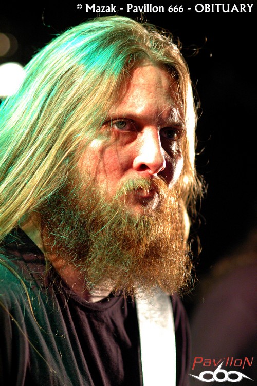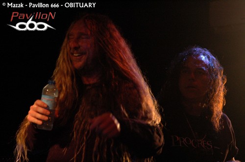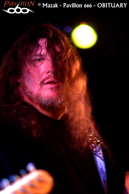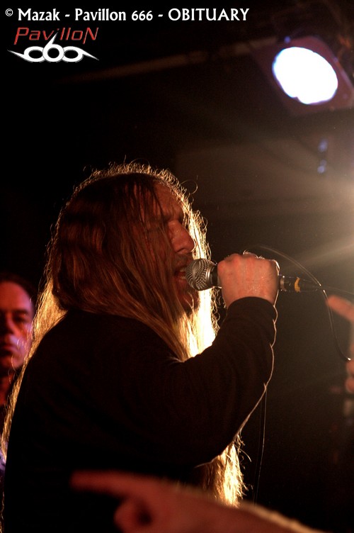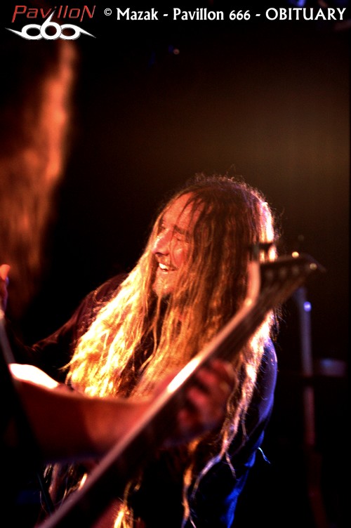 La SECRET PLACE s’est transformée en sauna, les murs suintent et les déplacements deviennent improbables et risqués. Les membres d’OBITUARY auront quelques difficultés à accéder à la scène. Les backstages sont à l’extérieur et il faudra aux floridiens plusieurs minutes pour traverser la cohue. Le plaisir est immense de pouvoir assister à un set du groupe dans un tel contexte. Il est tout de suite évident que le professionnalisme du groupe n’est plus à démontrer, et le plus surprenant réside dans un aplomb « mode sourire et décontraction » à mille lieux de la musique ici proposée. Loin des grandes scènes souvent impersonnelles, les zouaves se régalent. Le « Redneck Stomp » du départ mettra tout le monde au parfum ! L’endroit devient irrespirable et la suite ne sera qu’un enchainement de « classiques ». Les moments de bravoure, et ils seront nombreux, se succèdent sans aucun temps mort : « Threatening Skies », « The End Complete », « Evil Ways » et un « Slowy We Rot » d’anthologie ! Le son est de bonne facture même si parfois l’on pourra reprocher une batterie un peu trop présente, étouffant légèrement les guitares. Hormis ce petit détail, OBITUARY prouve qu’il en a toujours dans le pantalon et qu’il mérite encore son statut de pionnier !