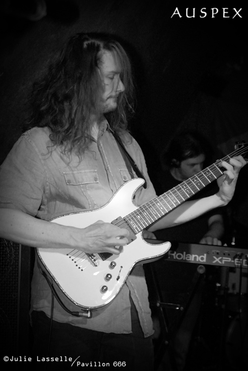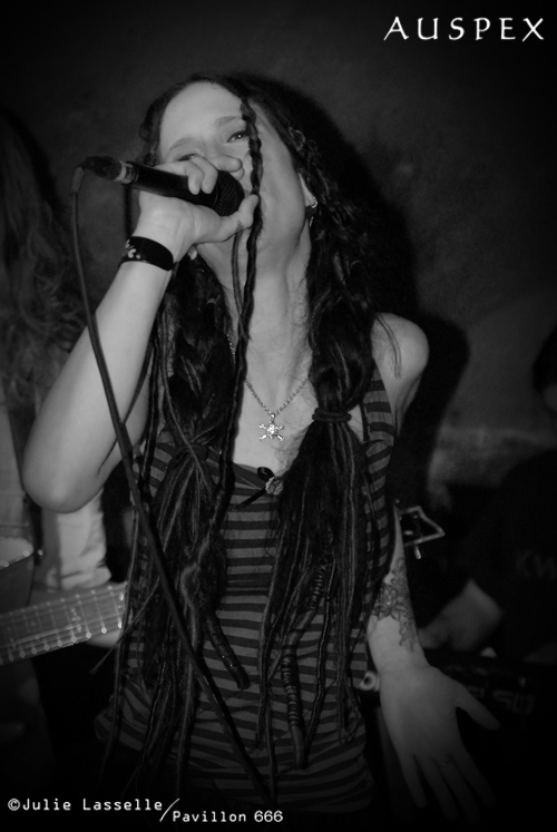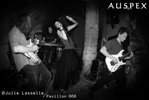 Ce sont donc les Grenoblois d'AUSPEX qui ouvrent le bal! Après l'absence de BENIGHTED SOUL, la seconde mauvaise surprise c'est l'absence du bassiste d'AUSPEX. C'est donc avec une basse enregistrée que le groupe de Métal Progressif jouera ce soir. Leur musique est un équilibre parfait entre des riffs de guitare entrainants voire même violents & une très belle voix féminine. L'atout principal d'AUSPEX c'est sa chanteuse Elodie qui possède une voix aussi bien lyrique & puissante que torturée & angoissante. Elle envoûte le public & donnera même des frissons aux gens présents dans la salle. Une jolie voix accompagnée d'un synthé aux mélodies semblables à celles d'une boîte à musique & des solos impressionnants pour donner du relief aux morceaux, c'est AUSPEX. Le public est plus que réceptif à leur musique & le fait savoir par de grands cris de joie! Malgré l'absence de basse les autres membres du groupe ont su assurer un spectacle presque impeccable. On retiendra l'excellent "Phantoms" ou encore "Resolutio", un superbe morceau chanté en japonais & en français.