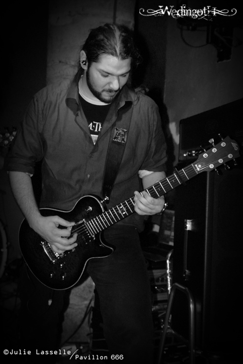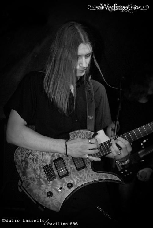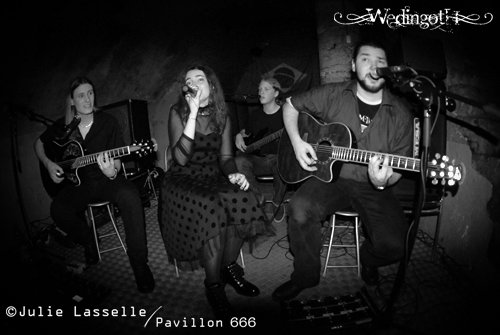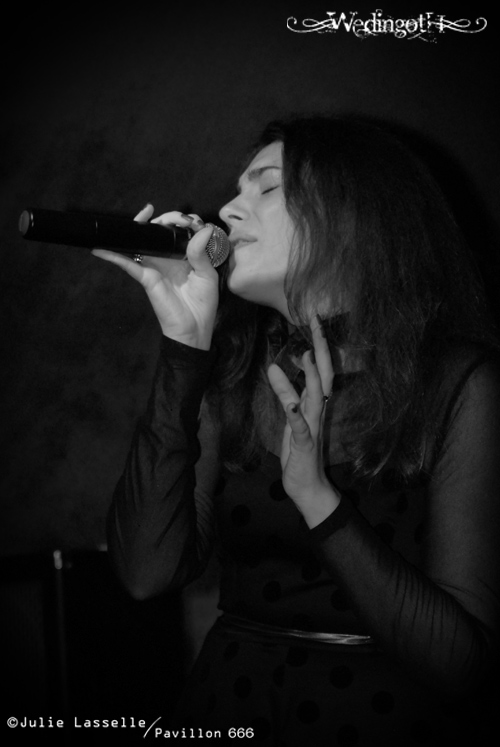 Pour la suite le Métal Café accueille WEDINGOTH, un véritable coup de coeur je dois l'avouer. Le groupe est né d'une histoire d'amour entre une voix & un guitariste qui ont été rejoints par un second guitariste, un bassiste & un batteur. WEDINGOTH a tout récemment signé avec M&O Music pour leur second album qui sortira en Février 2012. Tout comme AUSPEX, ce soir le groupe n'est pas complet & c'est un batteur qui leur fait défaut! Après quelques morceaux joués avec une batterie enregistrée (ce qui n'est vraiment pas génial) ils entament un set accoustique. Contrairement à ce que l'on peut penser, le set accoustique de WEDINGOTH préserve la puissance des riffs de guitare & les solos sont tout aussi beaux. Comme pour je le disais pour AUSPEX, ce groupe ne serait rien sans la voix de Laure qui ne peut que nous impressionner. On pourra en remarquer toute la puissance dans les morceaux comme "Utopia" ou "Diex Li Volt". Ce soir WEDINGOTH a su aussi faire oublier l'absence de leur batteur & le public du Métal Café est tombé sous le charme de ce set accoustique.