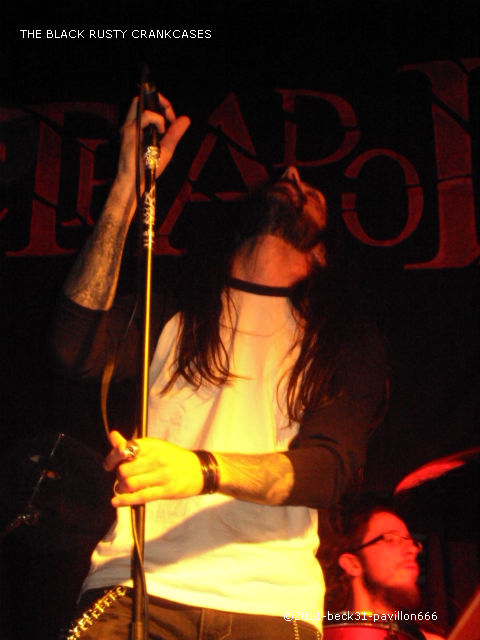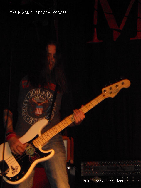 On passe aux choses sérieuses à 21h30 et l’invasion de la scène des locaux « THE BLACK RUSTY CRANKCASES ». Personnellement je ne connaissais pas ce groupe mais il a le don de faire monter l’adrénaline dans la salle dès les premières notes. Car le punk rock pratiqué par le quatuor est sur vitaminé : optant pour le style direct ils n’y vont pas de main morte. Rythme rapide, bon chant puissant, une musique proche de « BONESHAKER », « NINE POUND HAMMER », « THE RAMONES », autant vous dire que çà décape ! Certes ce n’est pas très original mais des groupes comme çà on peut les voir 15 fois en live et prendre toujours autant de plaisir. Le tout est d’aimer le punk rock et la sauce piquante !