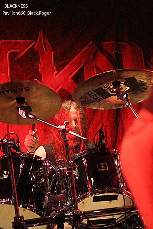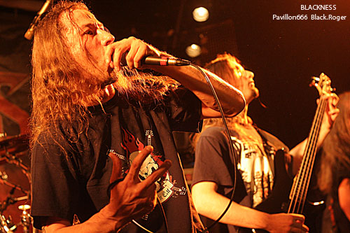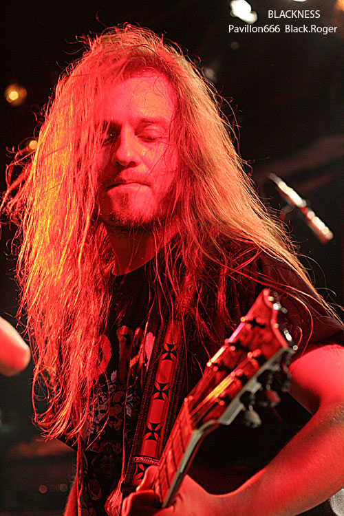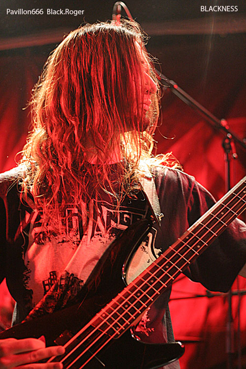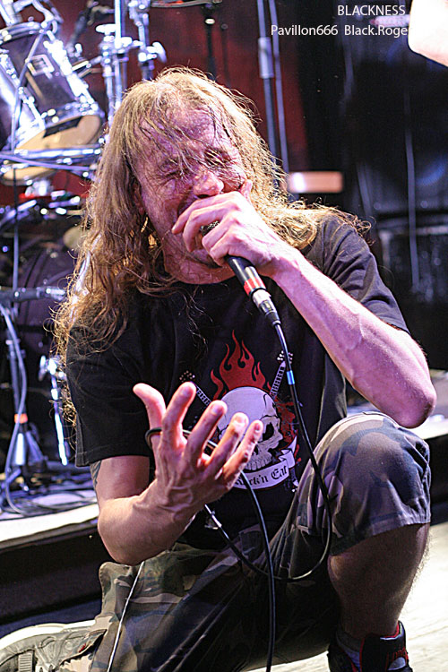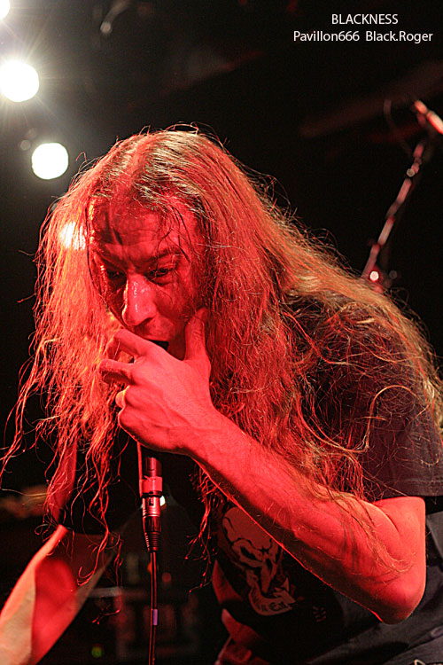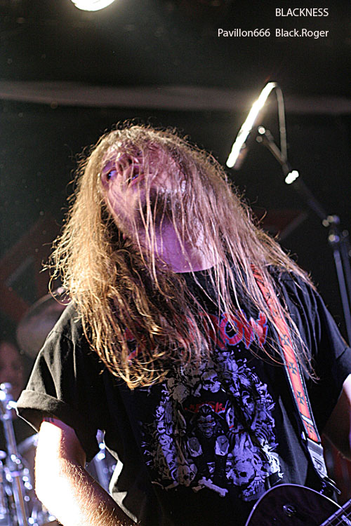 Place au thrash maintenant avec les bien connus thrashers fous de Lyon BLACKNESS. Le son est énorme, un peu trop tout de même car ça devient un peu « brouillon » par moments et la voix du frontman Pedro arrive difficilement à percer le mur de guitares. Pur Tharsh old-school au menu, le groupe s’est bien adapté à une démarche plus moderne notamment avec leur dernier album en date « Stimulation For The Beast » dont les titres seront largement repris ce soir. Les brûlots nous sont envoyés à la figure pratiquement non-stop. Inutile de vous dire que tout le monde s’éclate dans un Clacson chauffé à blanc avec bourrinages en tout genres et dérapages incontrôlés sur le sol inondé de bière. La fameuse reprise d’OZZY OSBOURNE « Bark At The Moon » est reprise en chœur par l’assistance survoltée, moment fort du show bien chaud des Lyonnais. A noter la présence forte et agitée du chanteur qui a maintenant laissé sa basse aux mains d’un cinquième larron. Le set touche à sa fin et le groupe quitte les planches. Rappel non réclamé, alors BLACKNESS revient quand même nous faire vibrer encore une fois sur un dernier titre intitulé « Saturday Night Killer », c.q.f.d. Très bonne prestation ce soir, c’est toujours avec un grand plaisir que l’on revoit le groupe en live.