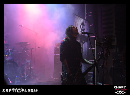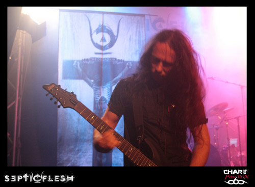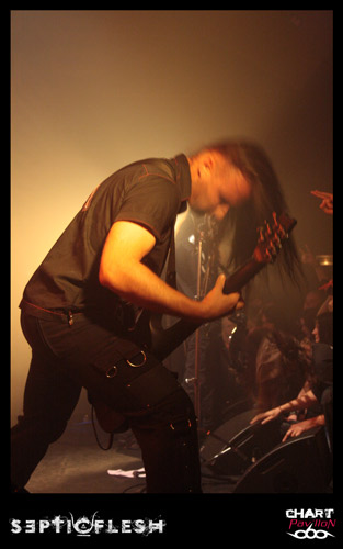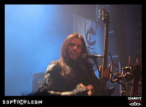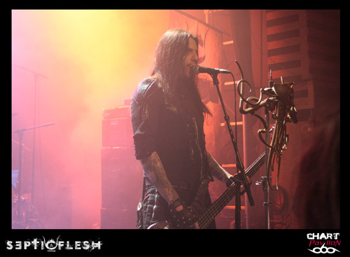 Comme je le disais plus haut, SEPTIC FLESH est actuellement en pleine promotion de son nouvel opus. C’est sur cette ambiance plus légère que celle de SVART CROWN mais néanmoins tout aussi efficace que le groupe fait son entrée sur scène. Il y a quelques années, le groupe avait eu l’occasion de participer au NUCLEAR FESTIVAL du côté de St Paul Trois Châteaux. Je sais que certains se souviennent de ce concert mémorable où NO RETURN avait retourné la salle. SEPTIC FLESH était à l’époque en tournée pour l’album « Revolution DNA ». Par rapport à cette période, on a l’impression d’avoir un nouveau groupe, nettement plus convaincant. Le groupe est vraiment devenu une bête de scène, musicalement et visuellement parlant. On a parfois l’impression de retrouver Nergal de BEHEMOTH et Sakis de ROTTING CHRIST dans la personnalité de Seth. Ces deux aspects sont dus à un jeu de scène charismatique. Le seul problème qui se pose à certains moments, ce sont des lignes de basses un peu sacrifiées. Peu importe pour ce groupe, le travail est fait. Nous ne sommes pas non plus à l’époque où Caligula « jouait » de la basse dans DARK FUNERAL. On retrouve dans la set-list du groupe quelques pépites avec notamment « Communion ». Le titre est repris avec énergie par le public. D’autres aussi semblent inspirer l’audience, « The Vampire From Nazareth », « The Great Mass of Death », « Pyramid God », « Lovecraft’s Death », « Anubis », le très rock n’ roll « DNA »… L’heure et quart de concert passé à une vitesse incroyable dans une chaleur étouffante. Mais tout le monde semble ravi de ce concert et ce ne peut être que gratifiant pour un groupe qui aime venir jouer en France.