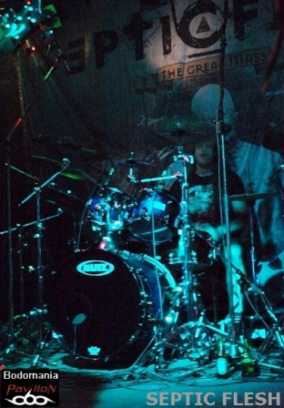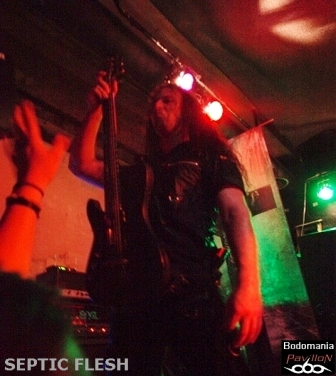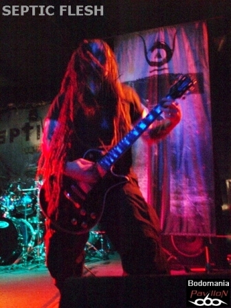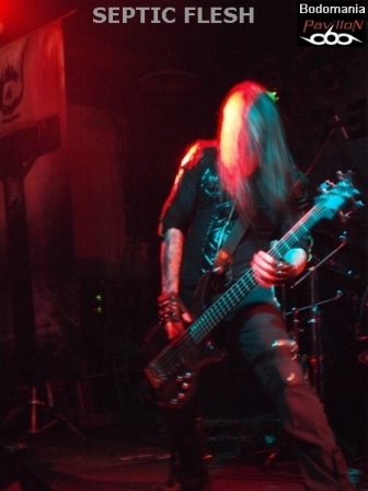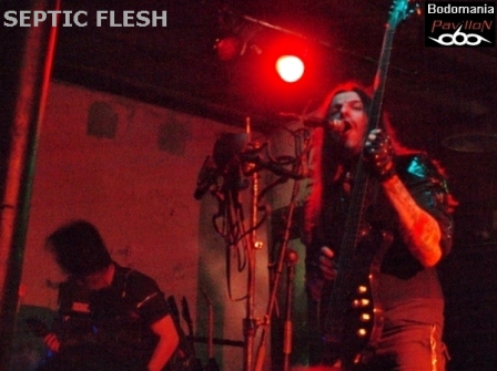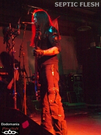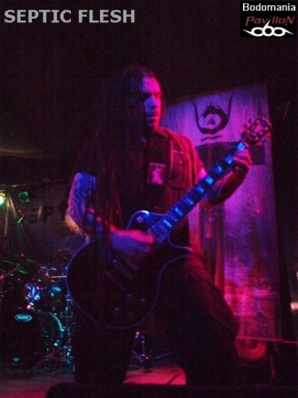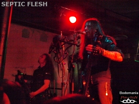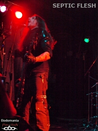 Un peu de patience avant l’arrivée, forcément très attendue du dernier groupe. Tout le monde est là cette fois... Quelques goutes de sueur et de bière plus tard, "Le Complexe" est plein. Il est temps de se frayer un passage pour se retrouver sous le micro superbement orné de Seth. Nul besoin de vous présenter SEPTIC FLESH? Si? Un peu? Formé en 1990, pratiquant un Death Metal à la fois Heavy, Black, Gothique et orchestral. Traitant de Philosophie et de Mythologie Grecque dans leurs textes. Huit albums, dont "The Great mass", le petit nouveau paru il y a à peine un mois, qui accueille au passage l’orchestre philharmonique de Prague en son antre. De nombreuses tournées en 20 ans, une signature chez "Season Of Mist"... C'est le moment d'accueillir SEPTIC FLESH!